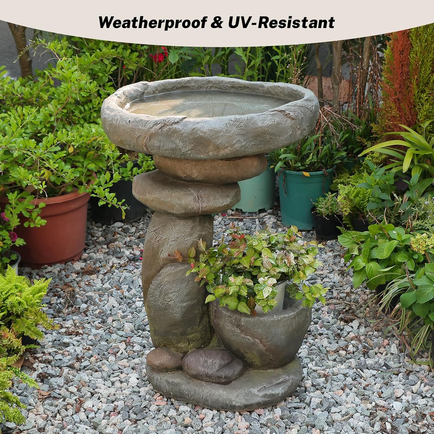 Constructed from high-quality resin and fiberglass composite, this fountain is built to last. It resists UV damage and weather elements, ensuring long-term use even in outdoor environments.