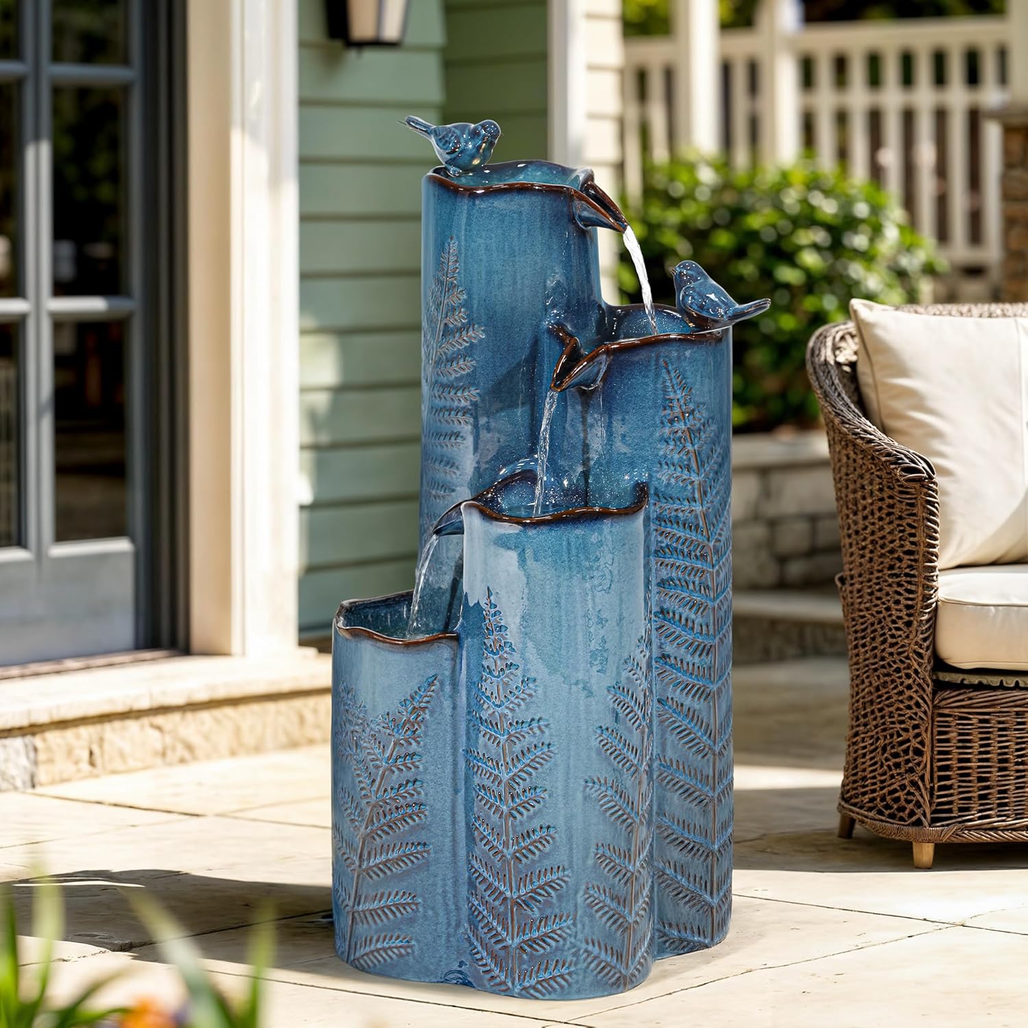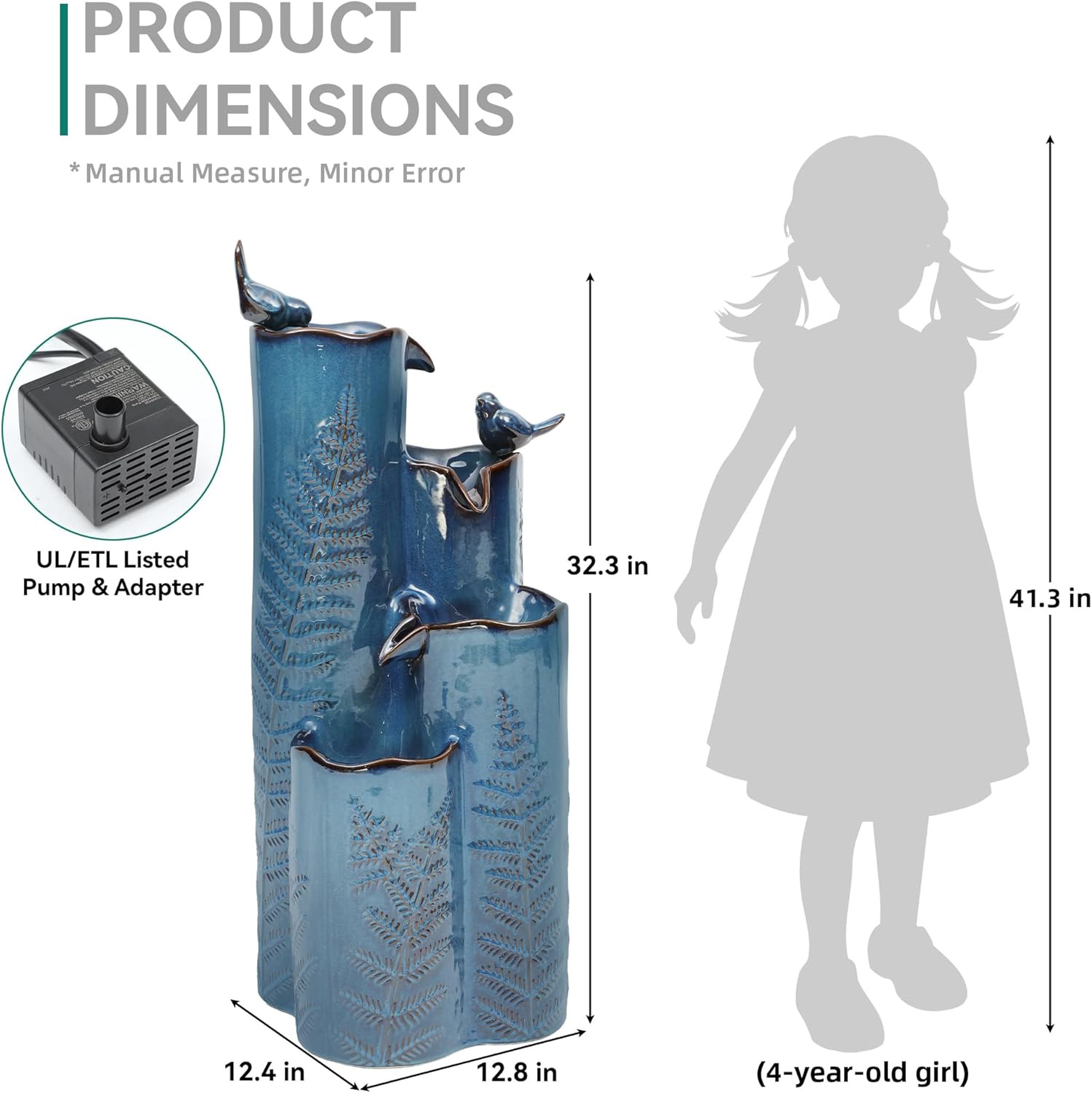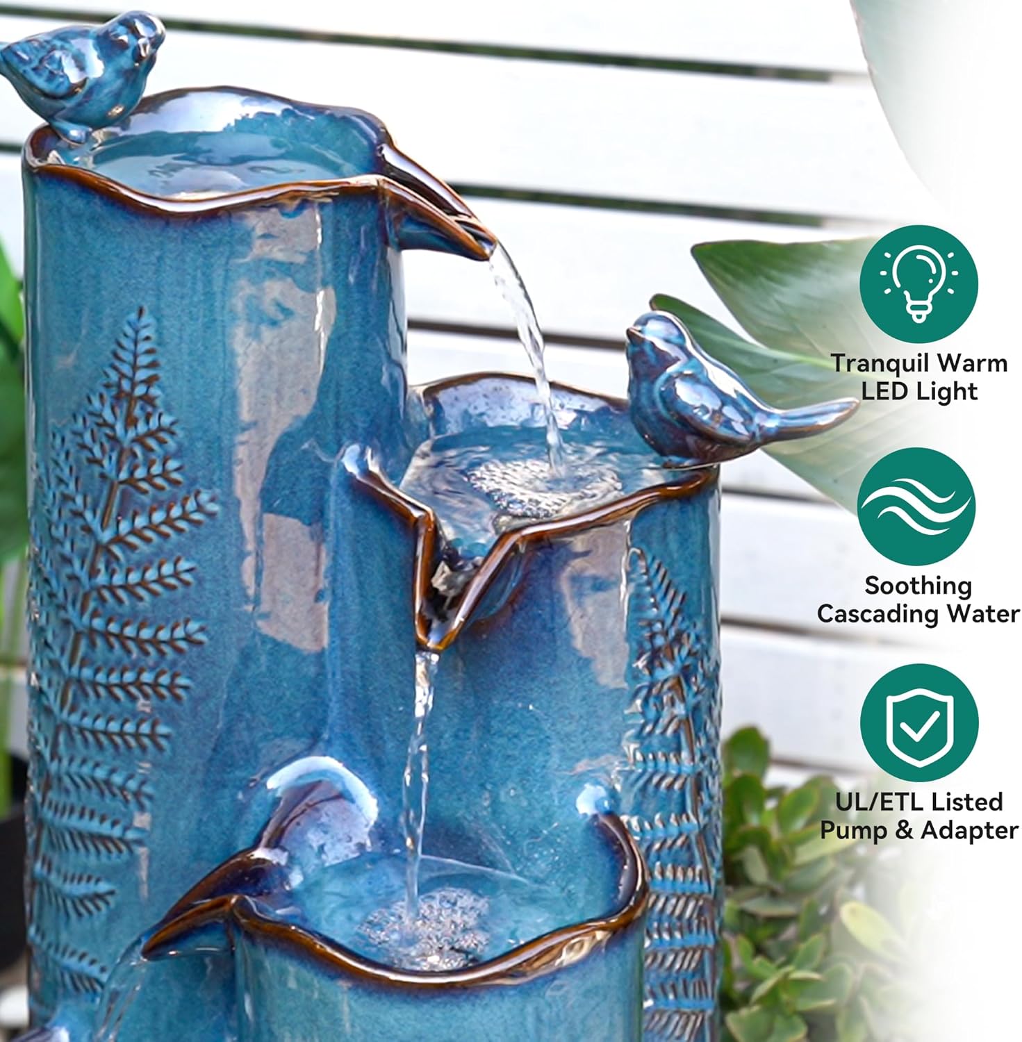 Combine the beauty of nature with the sophistication of art with this 32" H water fountain. Designed to create a calming atmosphere, itâs the perfect complement to your garden, patio, or backyard, transforming it into a peaceful retreat. This fountain boasts a 4-tier ceramic structure adorned with handcrafted reactive glaze, offering a stunning, detailed visual that enhances your landscape. The intricate fern patterns give it a timeless, organic appeal that blends seamlessly with both modern and traditional outdoor décor. Featuring built-in warm LED lights, this fountain adds an enchanting glow to your space, especially in the evening. The soft illumination accentuates the gentle, cascading water flow, creating a magical ambiance thatâs ideal for meditation, relaxation, or simply enjoying the outdoors. Constructed with weather-resistant materials, this fountain is built to last and withstand the elements, ensuring long-term beauty and performance. It requires minimal maintenance, making it a hassle-free decorative piece for your outdoor living area. Complete with an included pump and power cord, this fountain is easy to set up and ready to use in no time. Perfect for those who want to enjoy the peaceful sounds and sights of flowing water without the complexity of installation. Whether you're looking to add a focal point to your garden, enhance the charm of your patio, or create a tranquil backdrop for your deck or balcony, this 32" H water fountain delivers both visual style and functional tranquility that you'll love.32" H Water Fountain â A Serene Addition to Your Outdoor Space