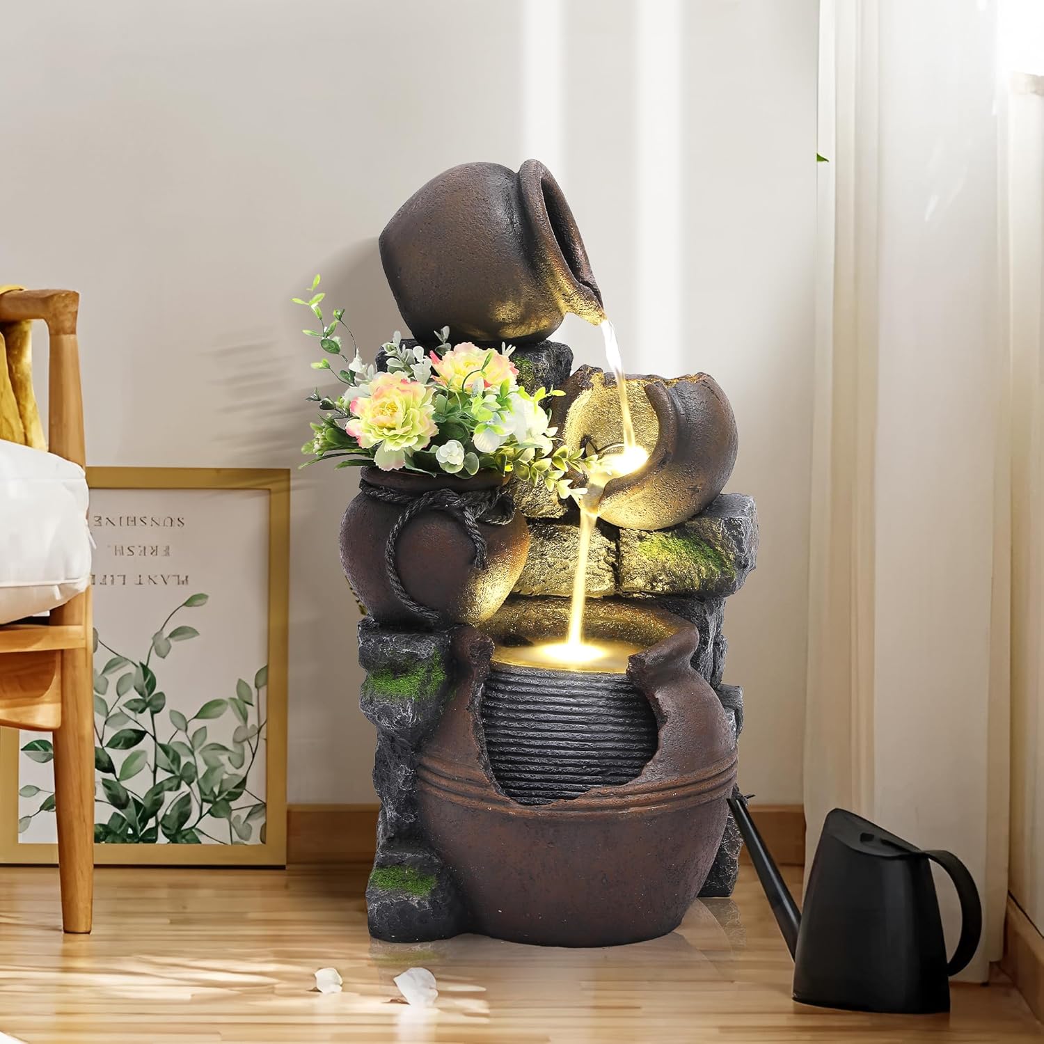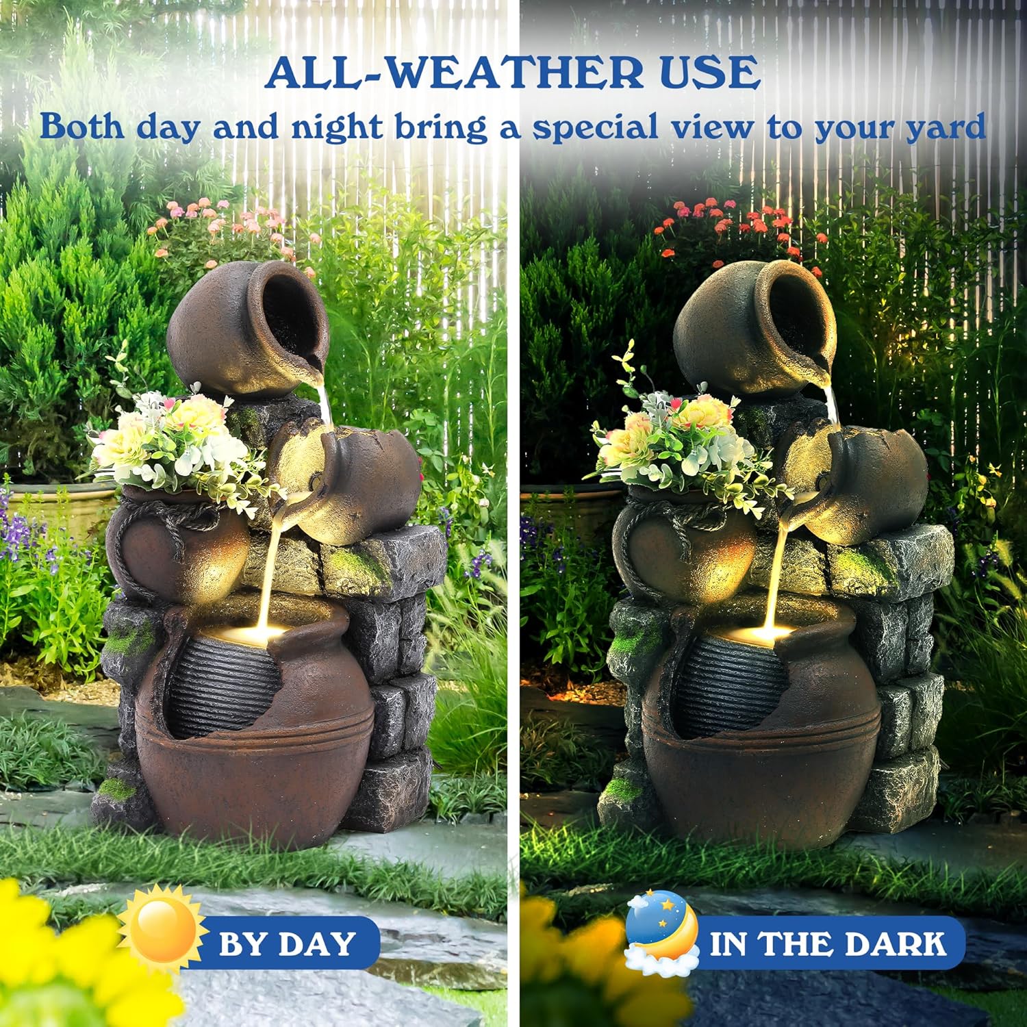 Add a touch of luxury and elegance to your garden or patio with this 4-tier waterfall fountain. Itâs not just for decoration â itâs a functional piece that promotes relaxation and mindfulness. Whether placed in your backyard, porch, or as a stylish entryway feature, this fountain blends beauty with practicality to elevate your living space.