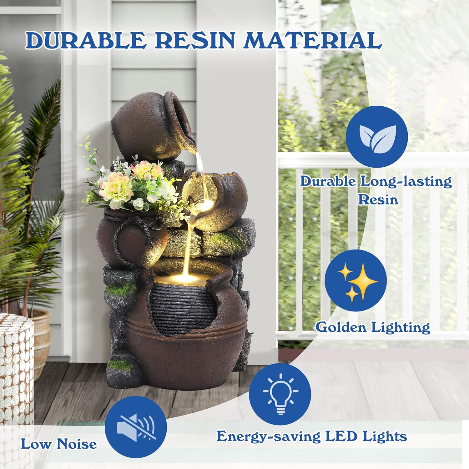 This freestanding resin fountain is built to last, with a durable construction that withstands outdoor elements and ensures long-term enjoyment. Ideal for both indoor and outdoor use, itâs a versatile addition to your home decor. The adjustable pump and light system let you customize the intensity of the display, making it adaptable to different spaces and preferences.