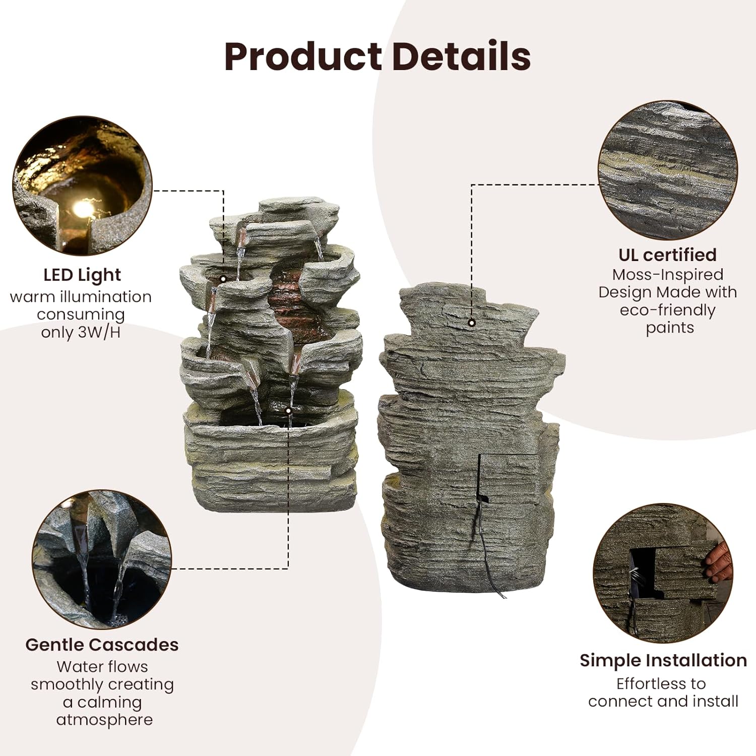 The freestanding waterfall design is both modern and timeless, perfect for enhancing your garden decor. Its realistic gray stone rocks and moss accents give it a natural look that blends beautifully with any landscape.