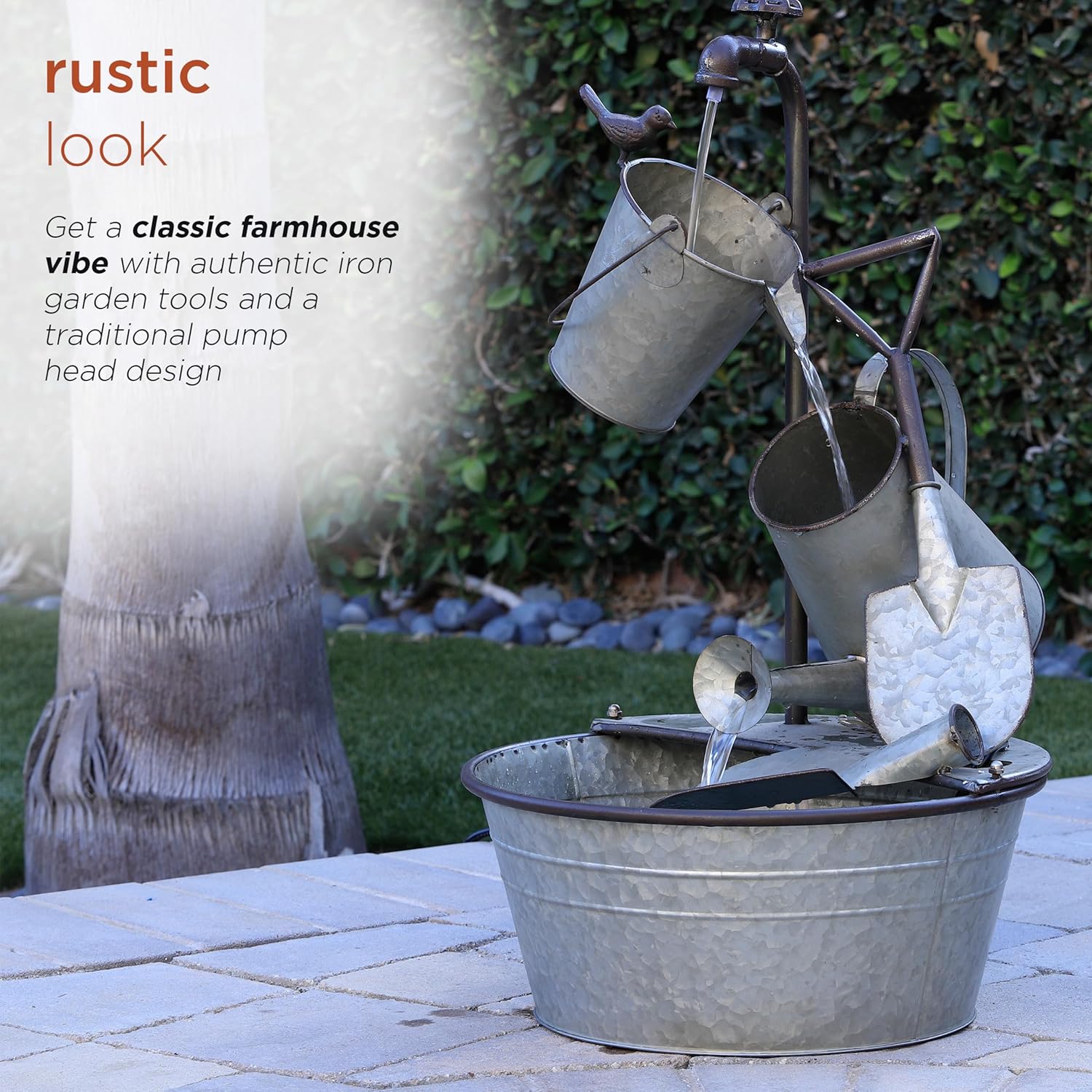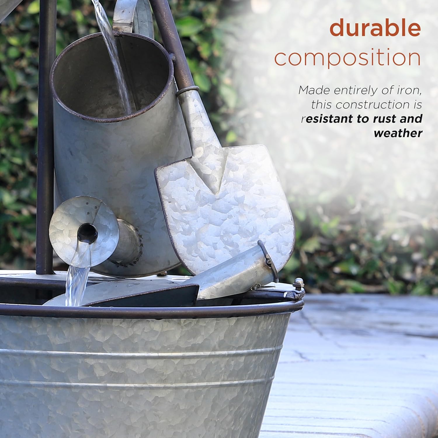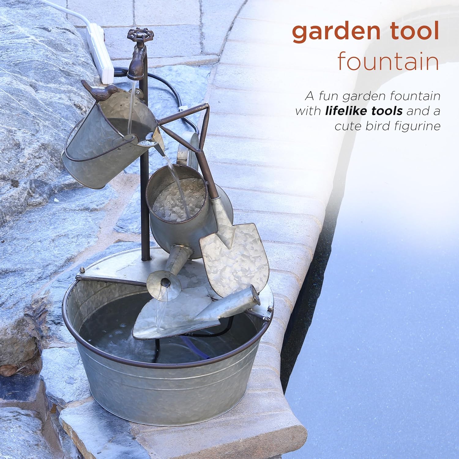 Create a relaxing atmosphere with the soothing sound of flowing water, enhanced by the rustic details of the garden tools design. This fountain serves as a conversation starter and a peaceful focal point, adding visual interest and a touch of nature to your living space. It's a versatile choice for those who want an outdoor decor fountain that doubles as a functional water feature, making it a great addition to patios, decks, or garden areas.