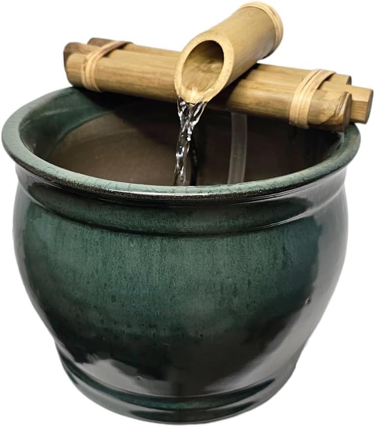 Constructed using durable bamboo and a high-quality green ceramic bowl, this fountain offers a striking natural look without the use of resin or plastic. Its minimalistic style makes it a versatile decorative piece that easily blends with modern or rustic interiors and exteriors.