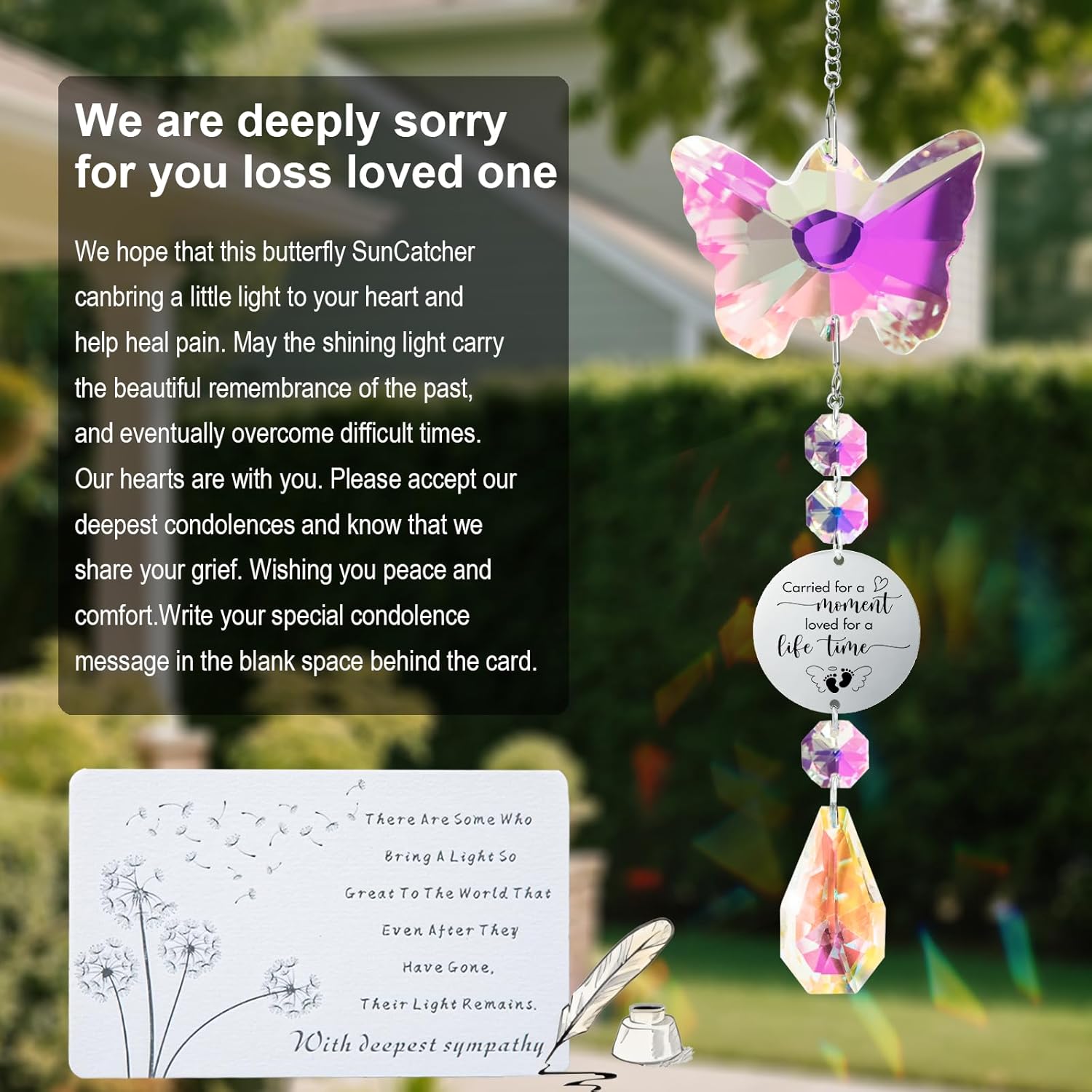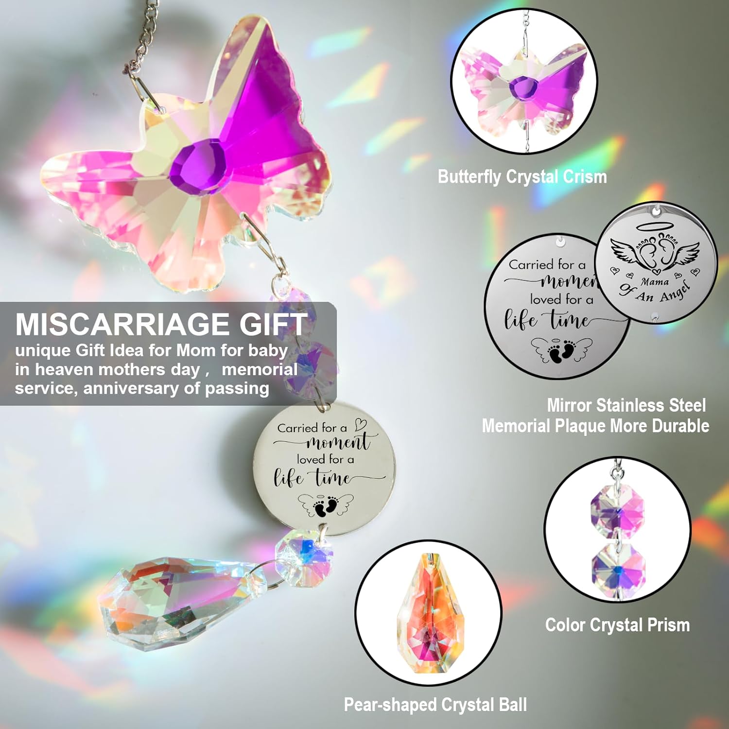 Whether you're seeking a sympathy gift for baby loss, a tribute for the passing of a loved one, or a meaningful way to celebrate a new life, this suncatcher combines elegance and emotion. The delicate butterfly symbolizes transformation and hope, while the rainbow light adds a serene and uplifting touch. Ideal for memorial spaces, itâs more than a giftâitâs a heartfelt companion during moments of loss and healing.