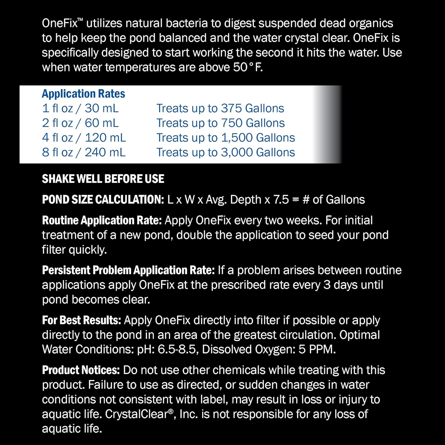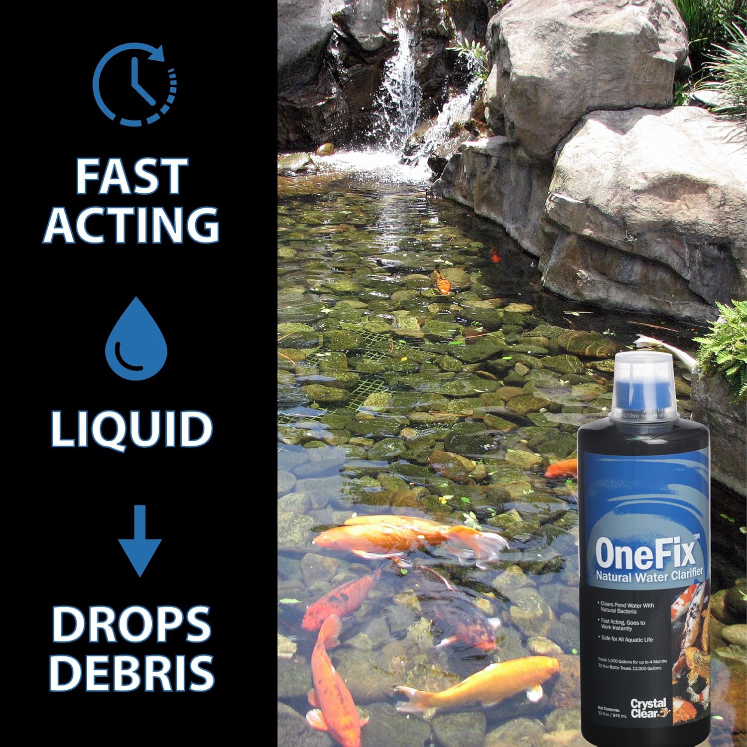 CrystalClear OneFix is a powerful and natural water clarifier designed to restore clarity to ponds, water gardens, and fountains in just days. It works by introducing beneficial microorganisms that target harmful organic debris, breaking down impurities and improving overall water quality. Whether you have a small outdoor pond or a koi fish habitat, this easy-to-use solution ensures a clean and healthy environment for aquatic life.