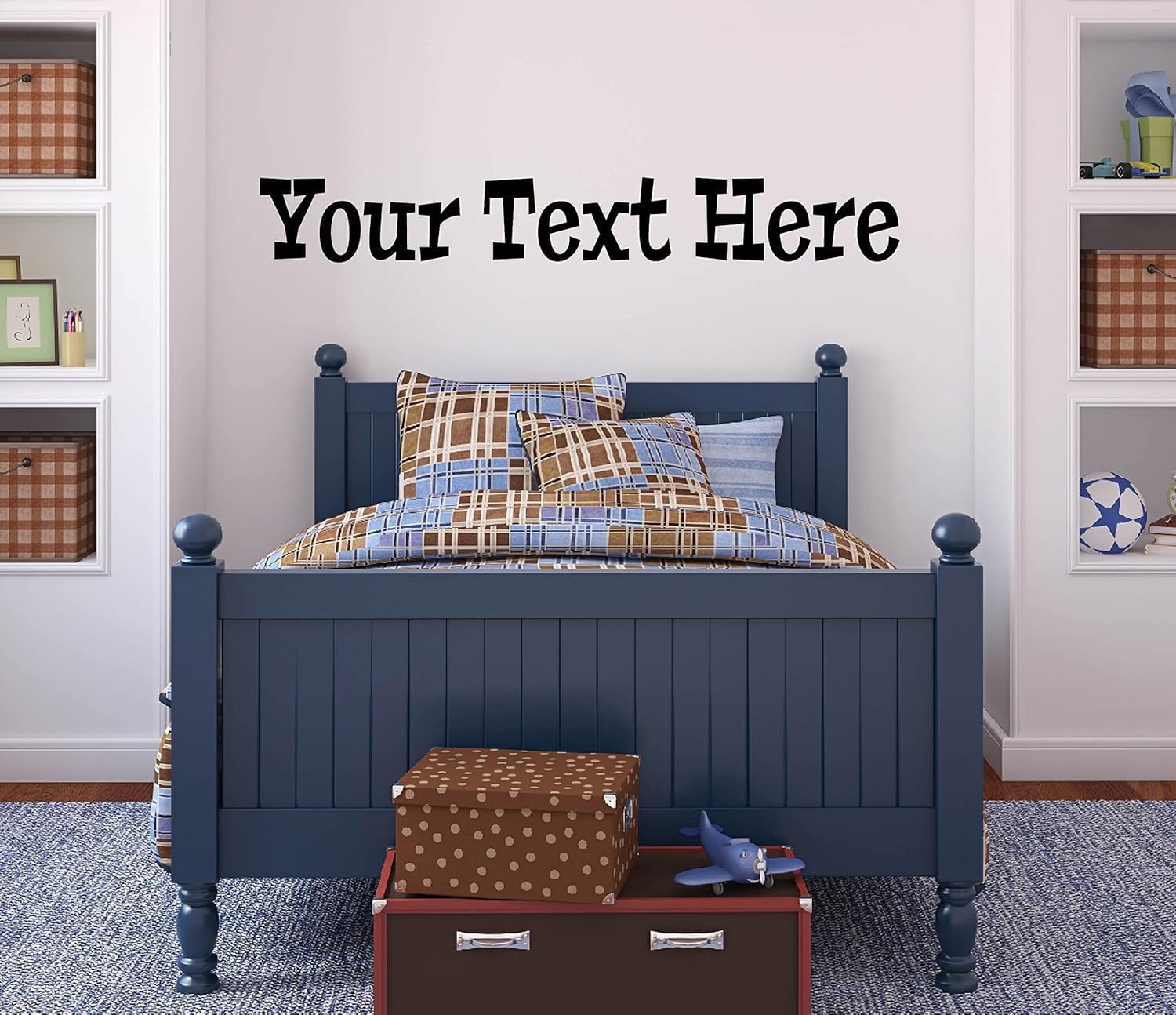 Custom text vinyl wall decal made with premium indoor removable vinyl. Offers personalized lettering, easy application, and versatile size options. Suitable for walls, mirrors, metal, and painted wood surfaces. Matte finish with illustrated instructions included.