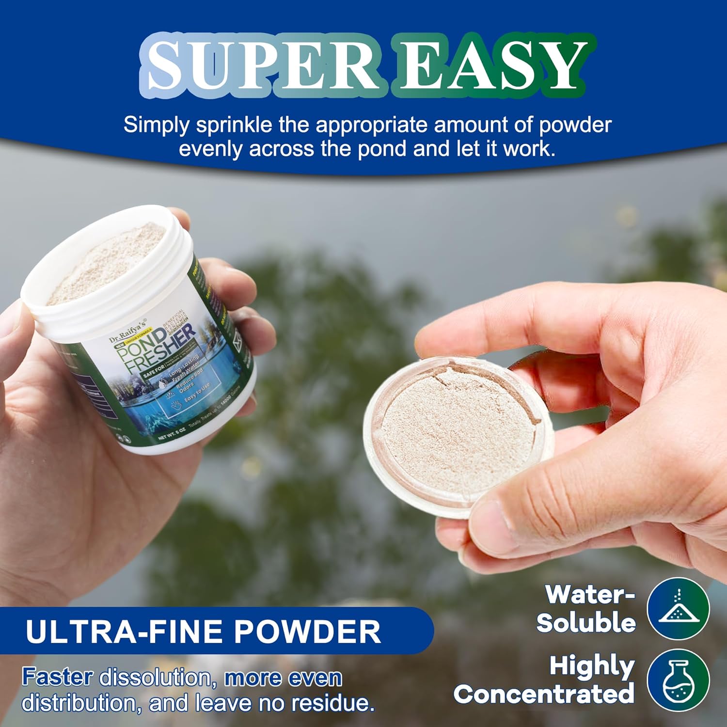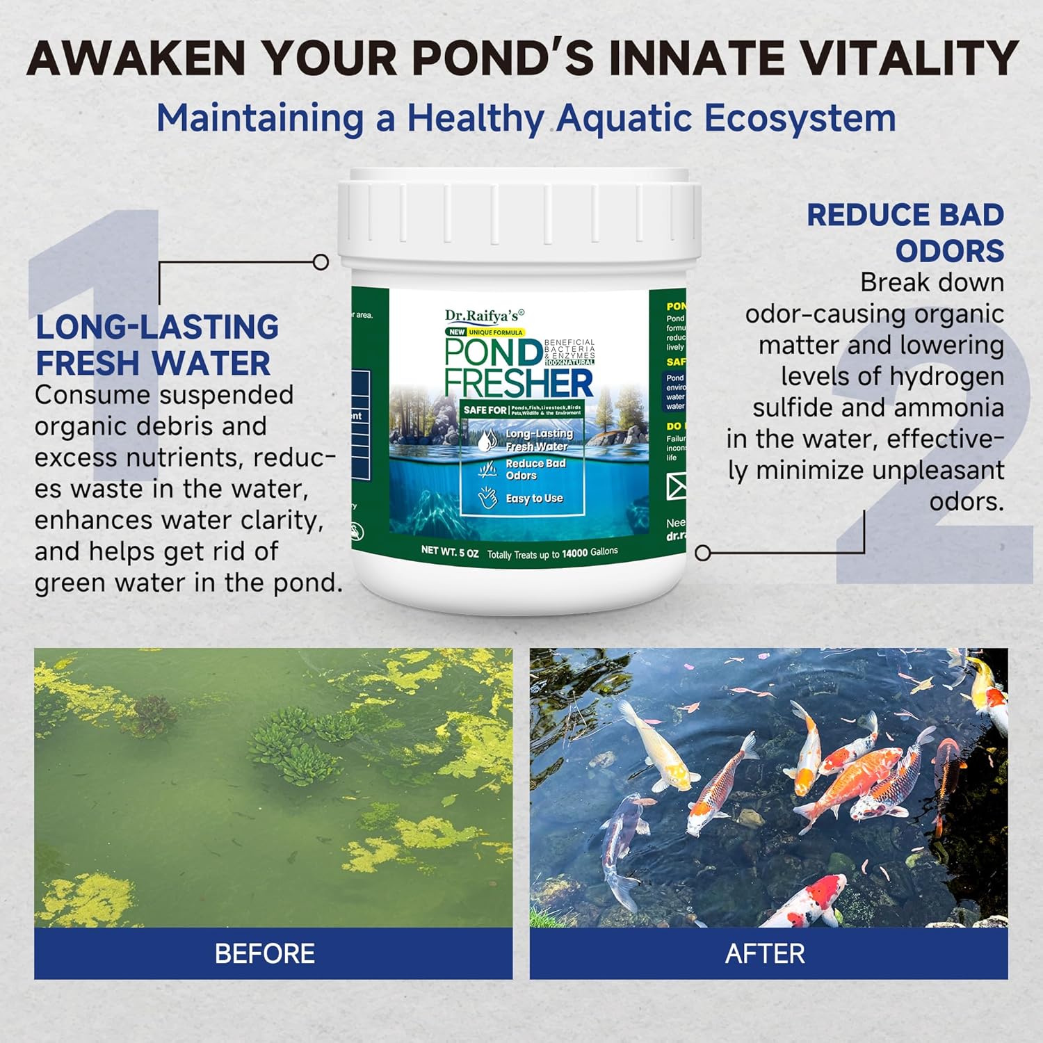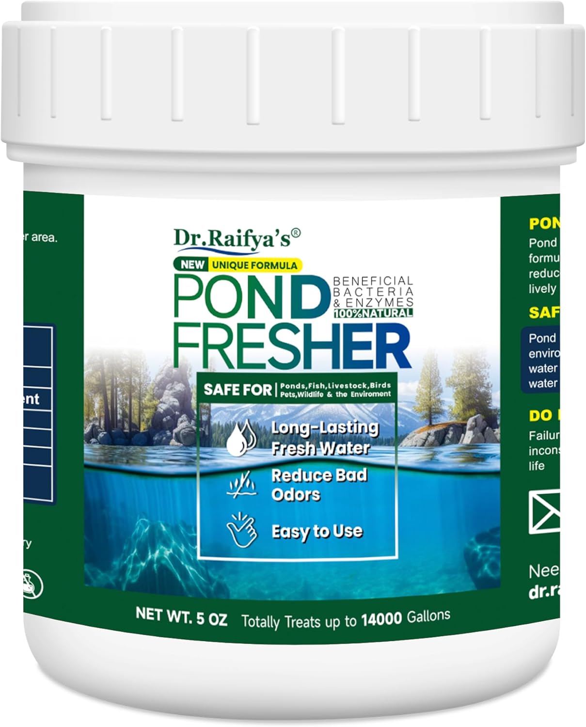 Dr. Raifya's Pond Fresher is a natural water treatment solution that keeps your pond clean, clear, and fresh. Infused with powerful beneficial bacteria and enzymes, it works to break down harmful organic waste and debris, restoring the natural balance of your aquatic environment. Safe for fish, pets, plants, and wildlife, this pond cleaner eliminates bad odors and excess nutrients without the use of harsh chemicalsâperfect for maintaining a healthy pond ecosystem.