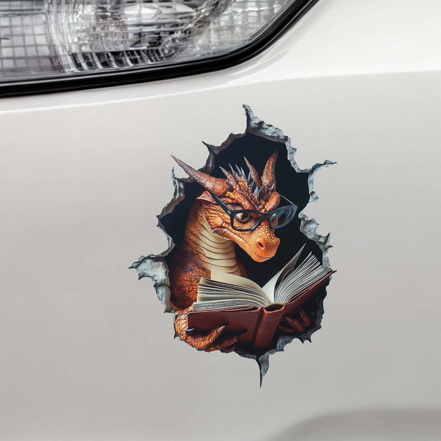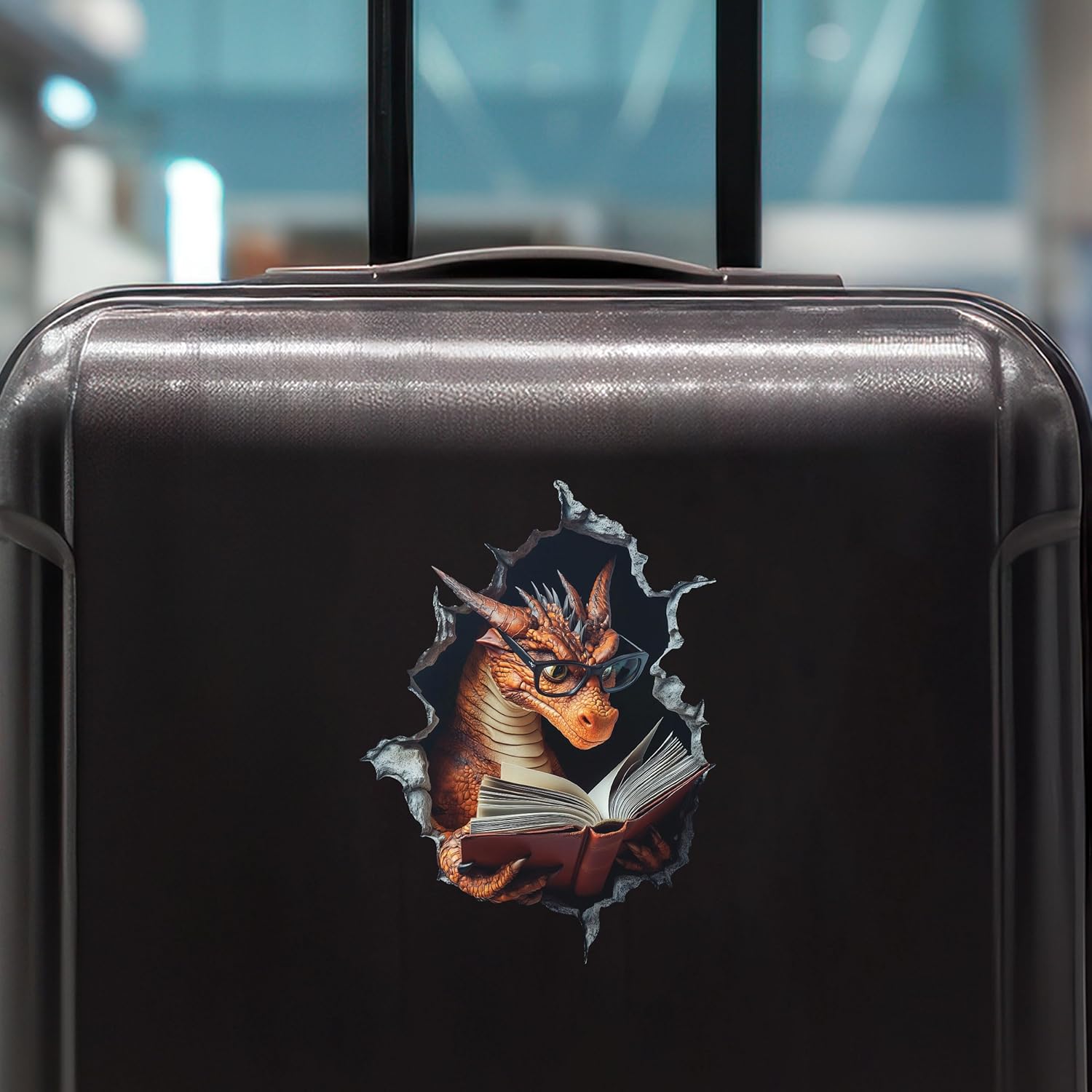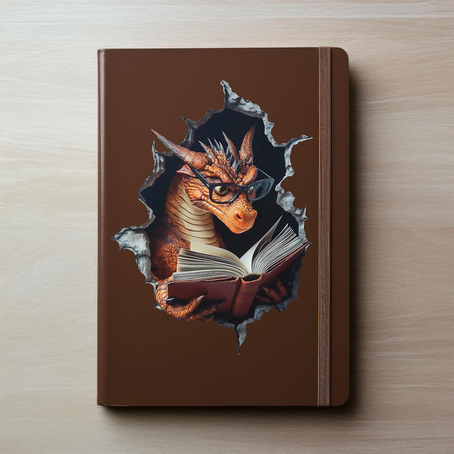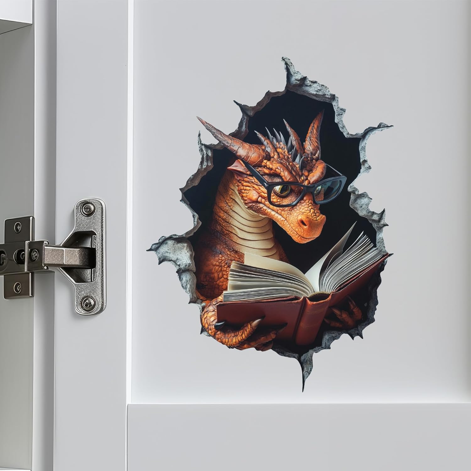 Elevate your walls with this enchanting dragon wall decal that combines elegance and imagination. The dragon is depicted in a scholarly setting, reading a book with its stylish glasses, creating a charming focal point for any room. Its 3D torn-wall illusion adds visual depth and intrigue, making it appear as though the dragon is peeking out from the wall. Perfect for book enthusiasts and fantasy lovers, it's a versatile decoration for walls, bookshelves, or reading nooks.