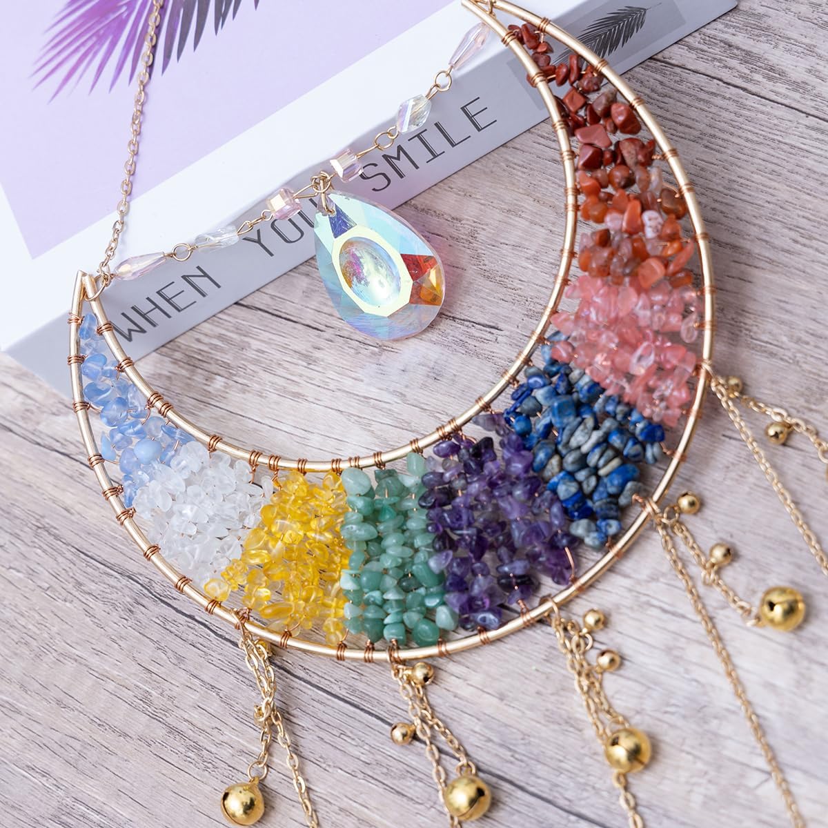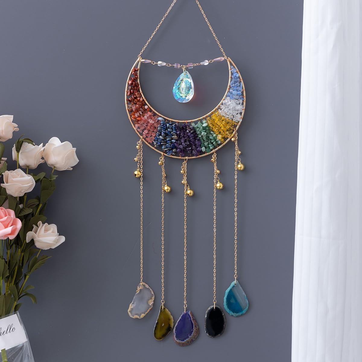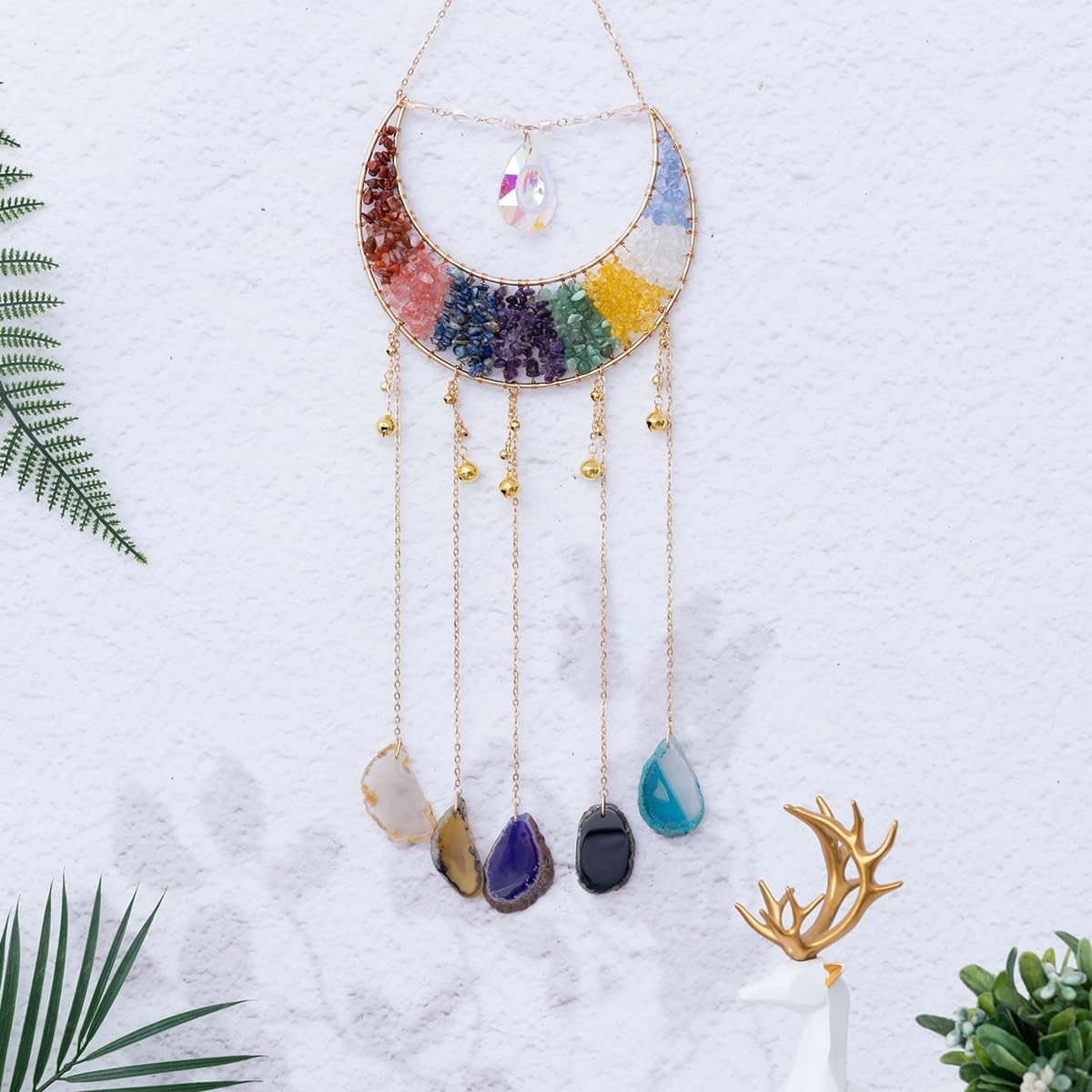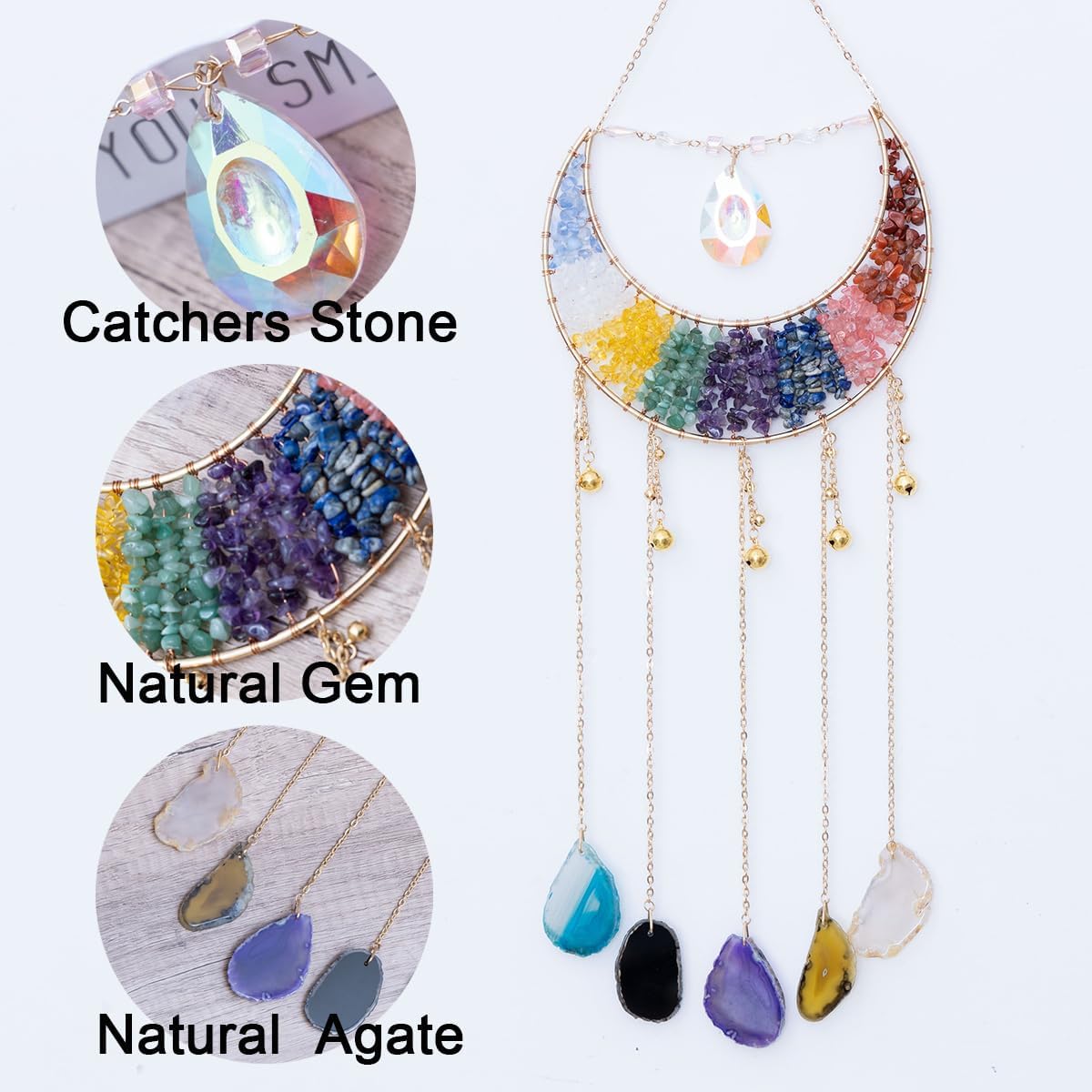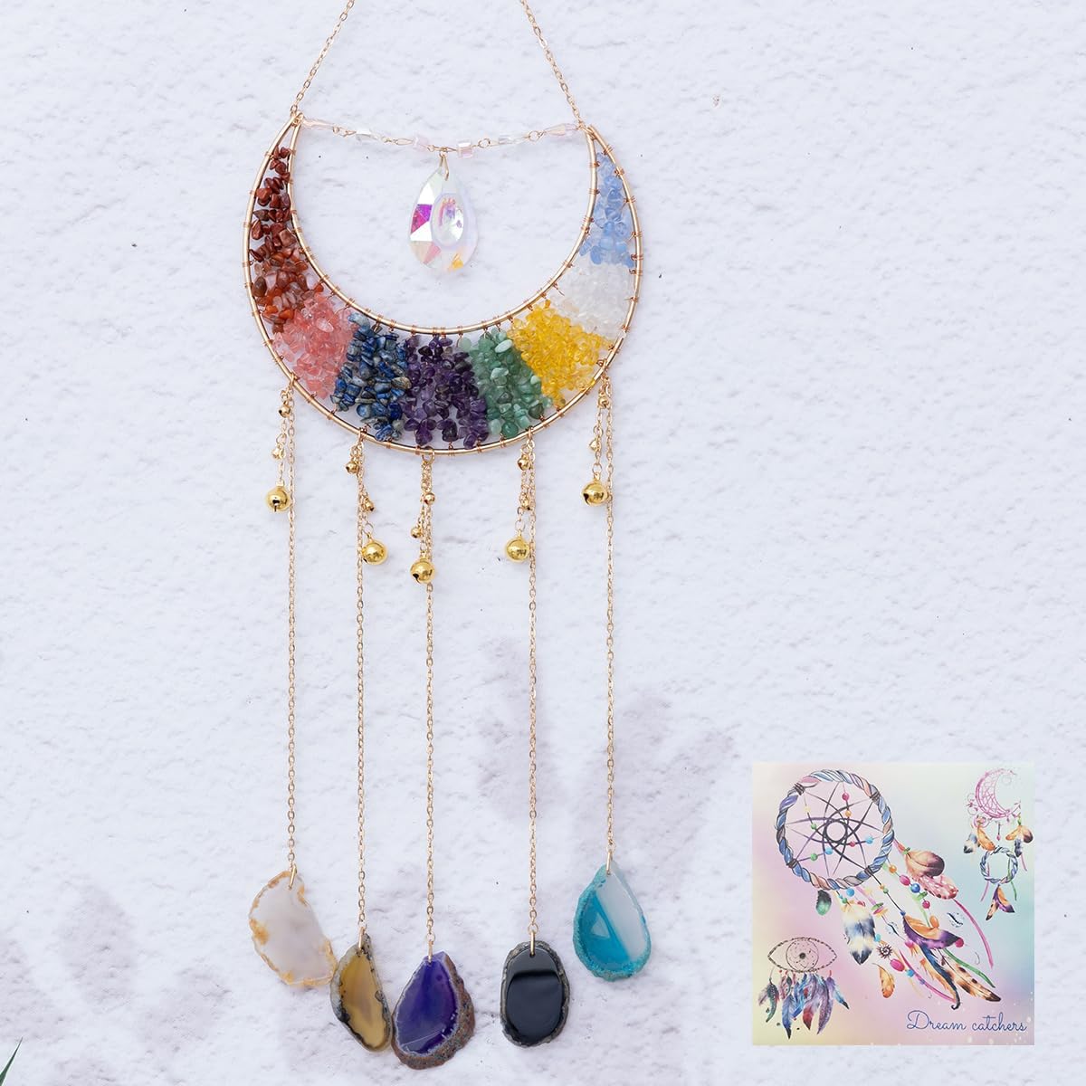 Whether you're looking to create a serene atmosphere in your living room or add a touch of meaning to a special gift, this dream catcher is designed to uplift your spirit and environment. Its multicolored agate stones reflect a wide range of energies, helping to promote calm, clarity, and overall well-being. The elegant structure and easy installation make it a cherished addition to your home decor collection.