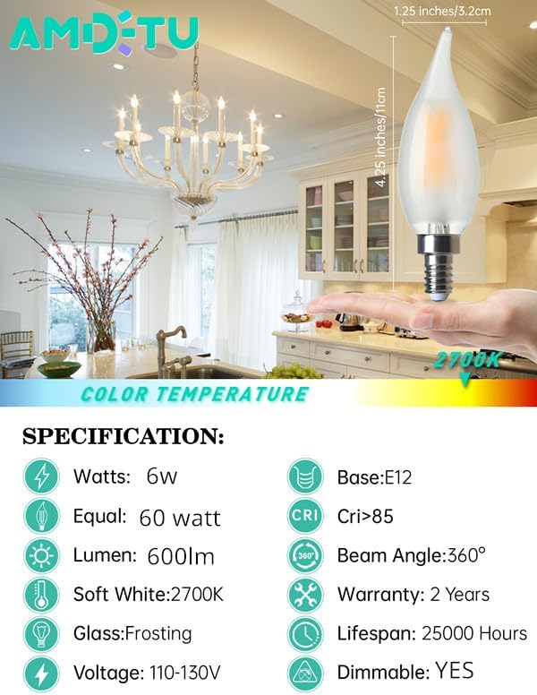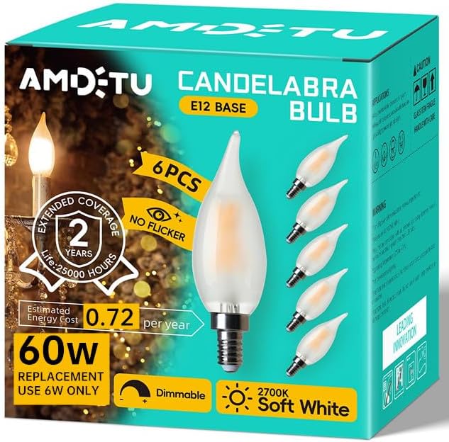 Enhance your home's lighting with a combination of style, efficiency, and reliability. These E12 dimmable LED candelabra bulbs are designed to provide functional and beautiful lighting for your indoor spaces.