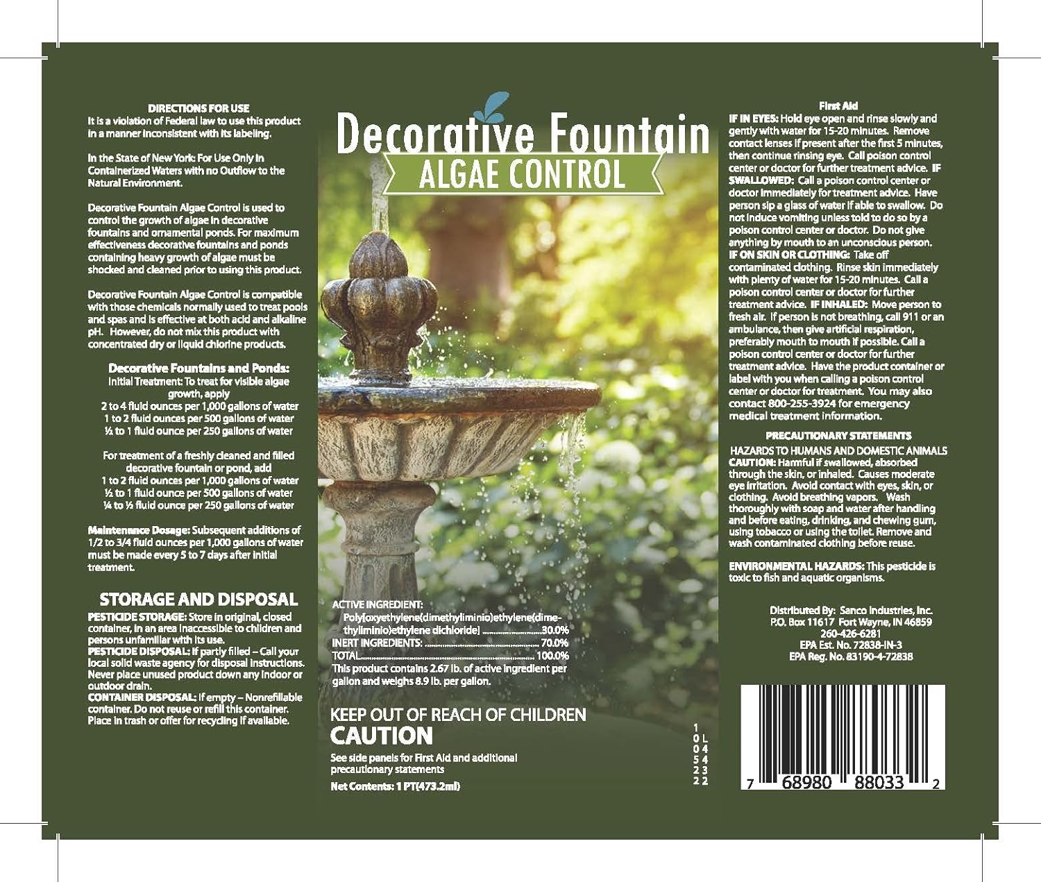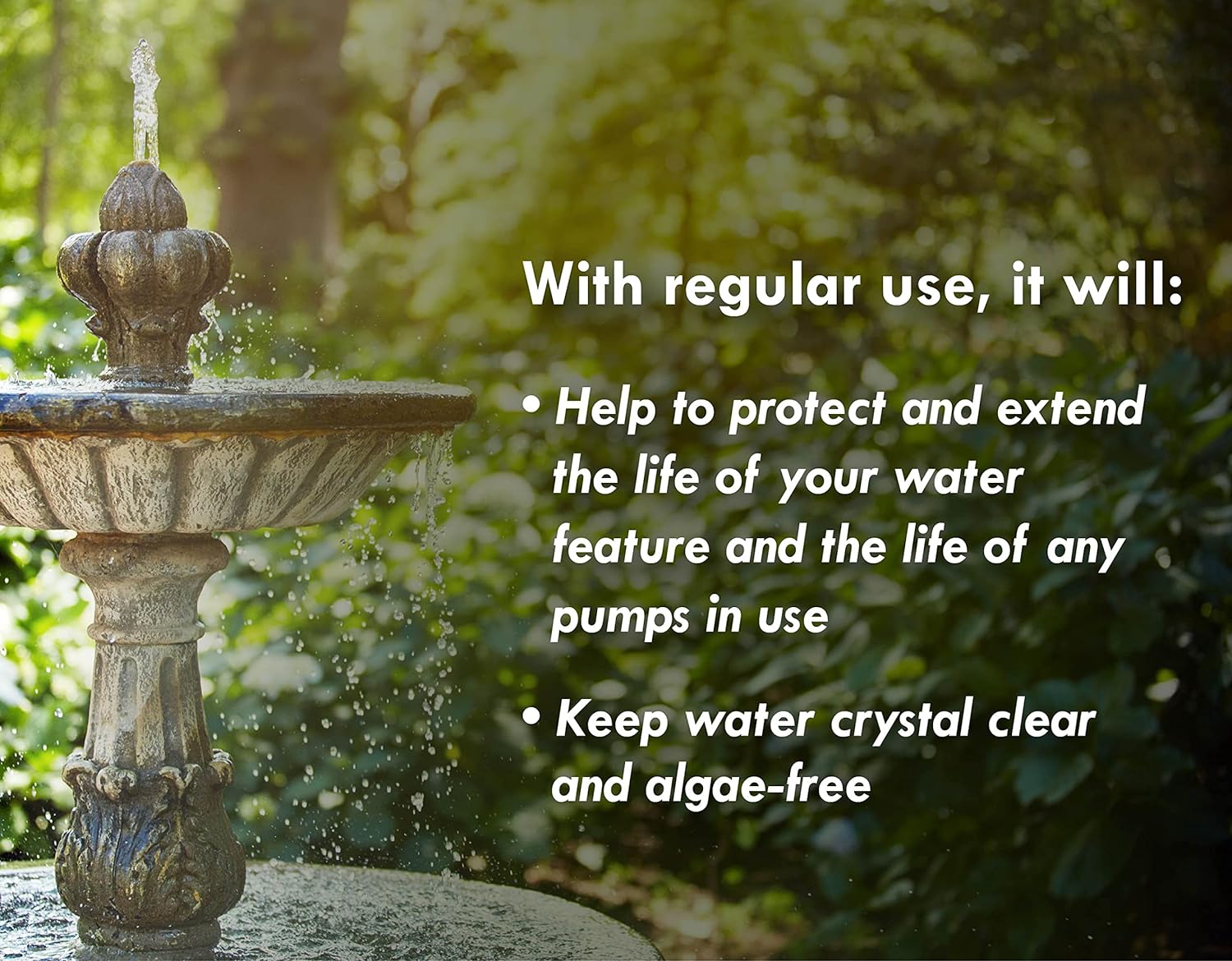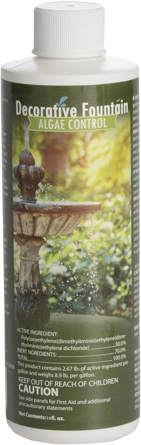 Fountain algaecide, pond clarifier, algae control solution, water garden treatment, green algae remover.