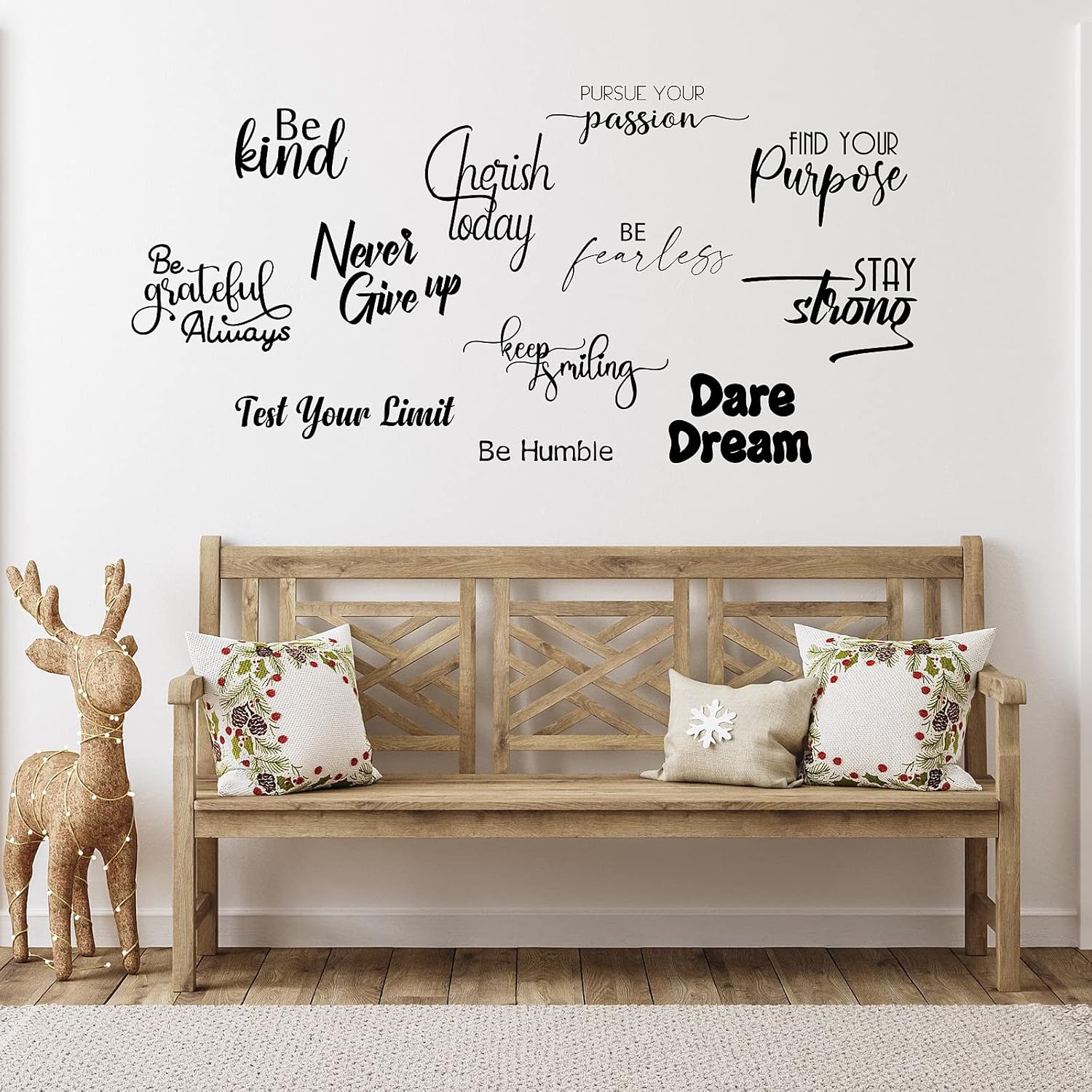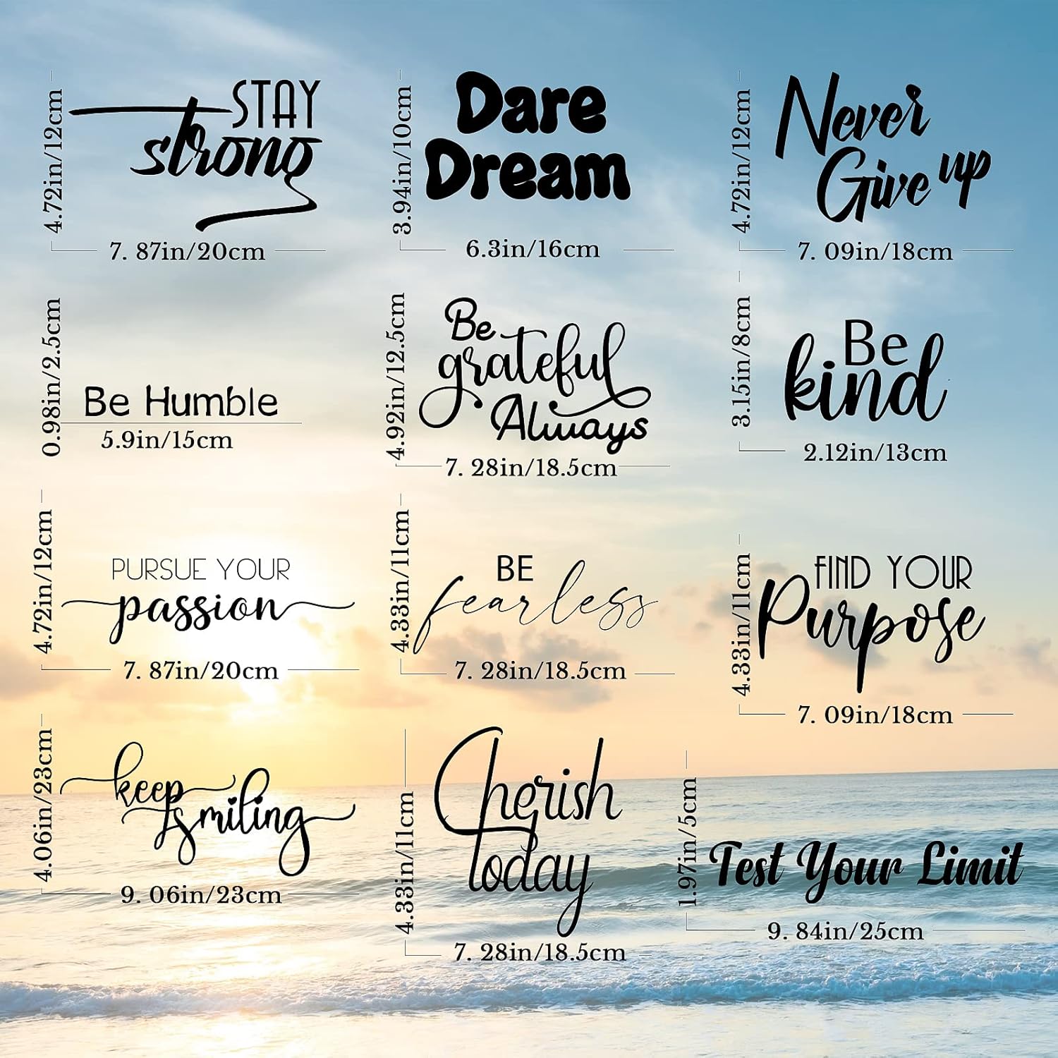 Fumete 12 Pcs Inspirational Wall Decals are easy to apply motivational quotes for walls and mirrors. Durable, waterproof, and stylish, they make great bedroom or office decor. These peel and stick vinyl stickers are perfect for inspiring positivity and can be used as gifts for friends, classmates, and colleagues.