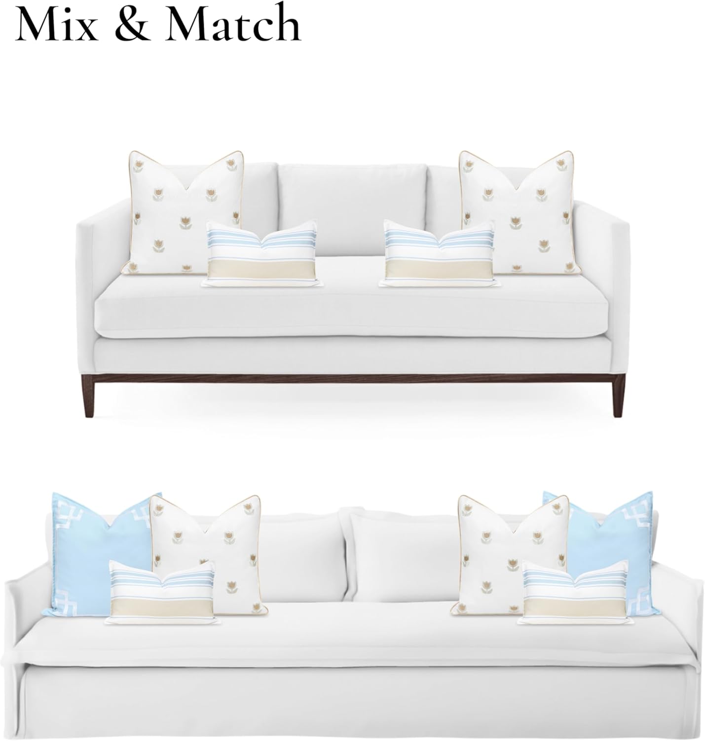 This pillow cover is designed with a coastal-inspired pattern that includes delicate tan embroidered tulips. These subtle floral accents complement modern or rustic interiors, creating a warm and inviting atmosphere.