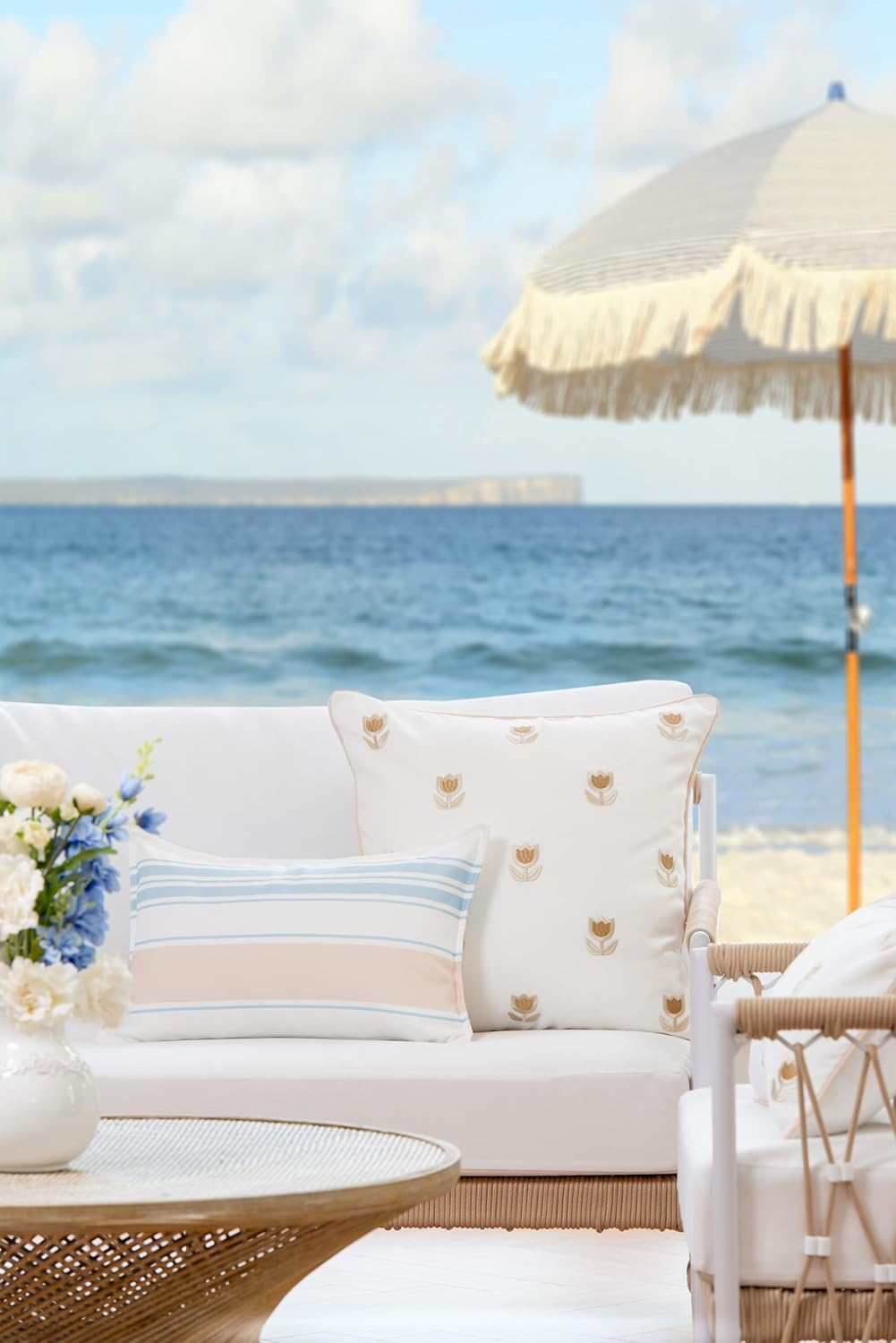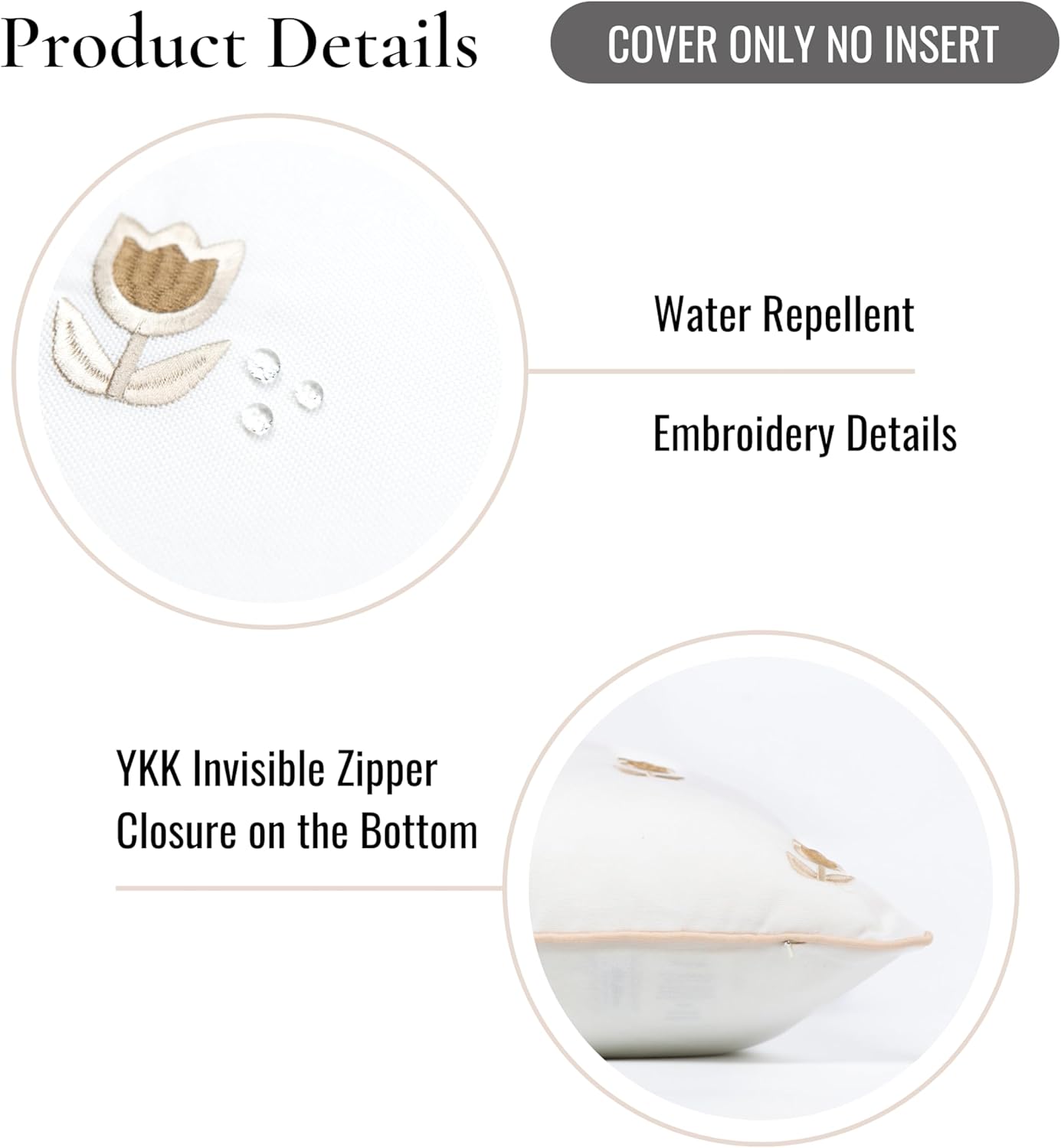 Keywords: coastal throw pillow cover, tan embroidered tulips, water resistant outdoor fabric