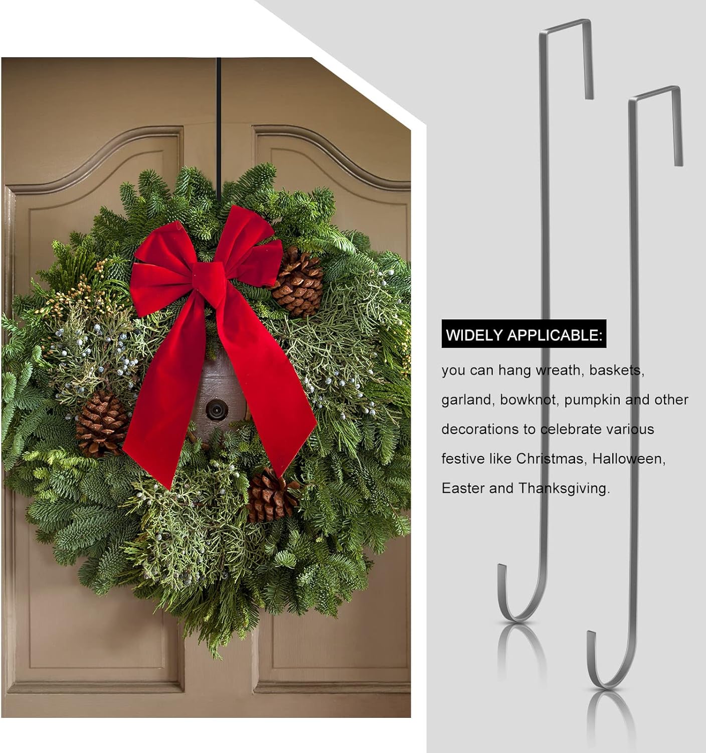 Elevate your doorway with these stylish and functional wreath hangers. Designed for both holiday and everyday use, they bring a touch of elegance to any entryway without the hassle of drilling or installation. The sleek black finish and robust steel construction make them a durable choice for seasonal decorations and daily essentials alike.
