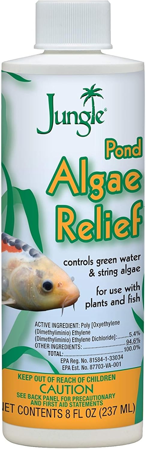 JUNGLE PL720-8W Pond Algae Relief clears green water and prevents algae growth. Great for ponds and water gardens, it controls suspended blooms safely. Non-toxic and eco-friendly formula for a clean, clear pond.