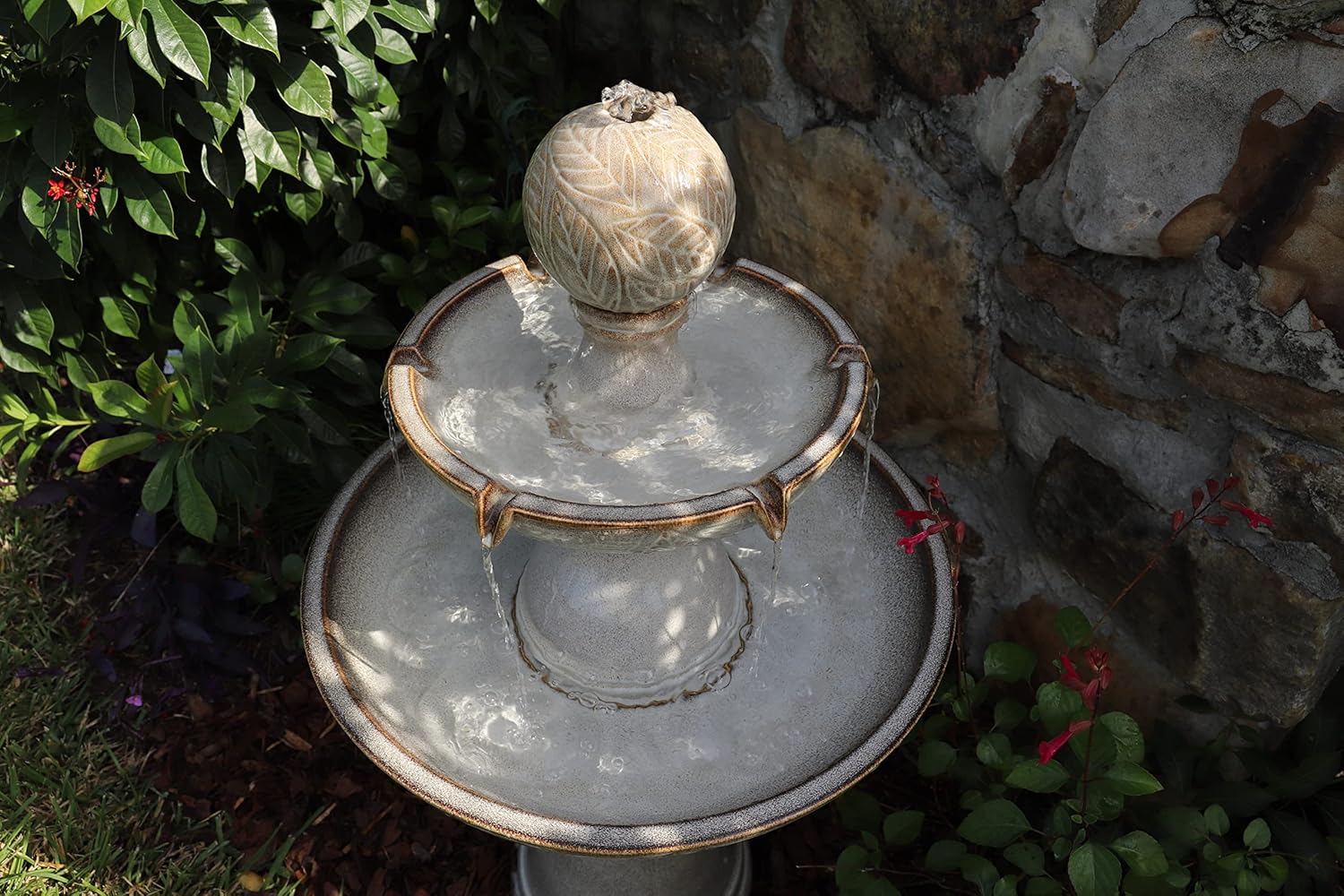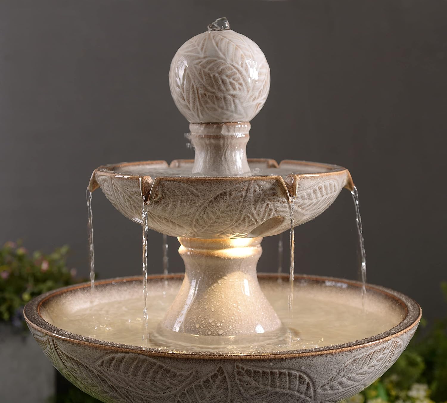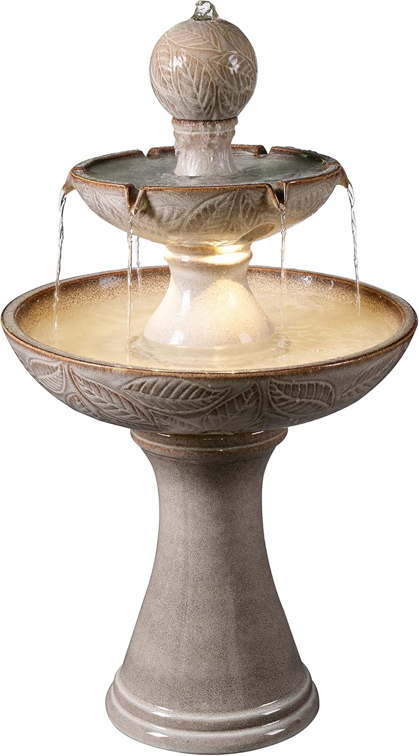Transform your outdoor space with this beautifully designed, small tiered fountain. Crafted from high-quality ceramic and finished in a delicate light ivory glaze, it is a timeless addition to any garden, patio, or yard. The intricate leaf motifs add a touch of classic elegance, while the dynamic LED lighting enhances the ambiance with a soft, glowing glow at night.