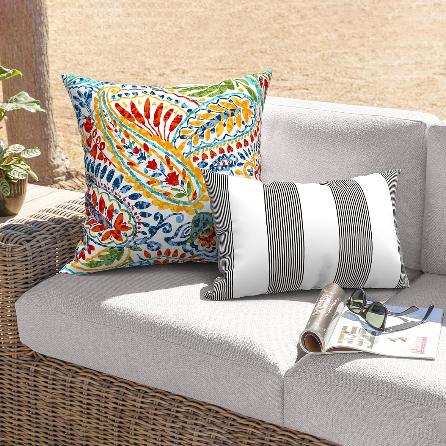 Melody Elephant offers a set of 2 handmade outdoor throw pillows with all-weather fabric, featuring a paisley pattern for stylish home and garden decor. Each pillow includes an insert, and is easy to clean and maintain.