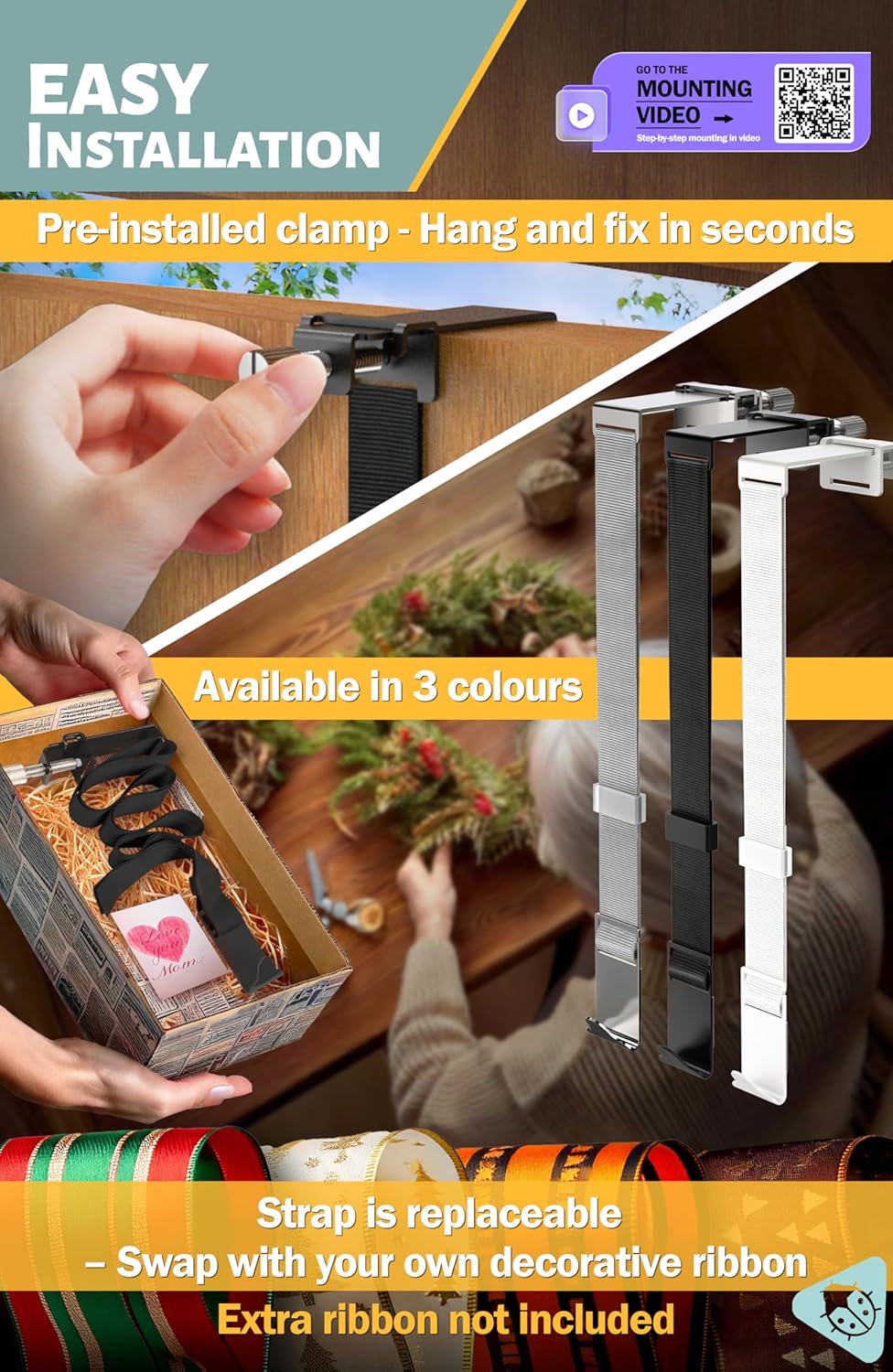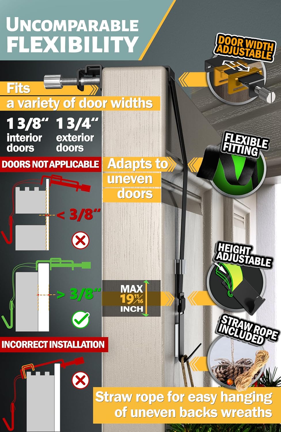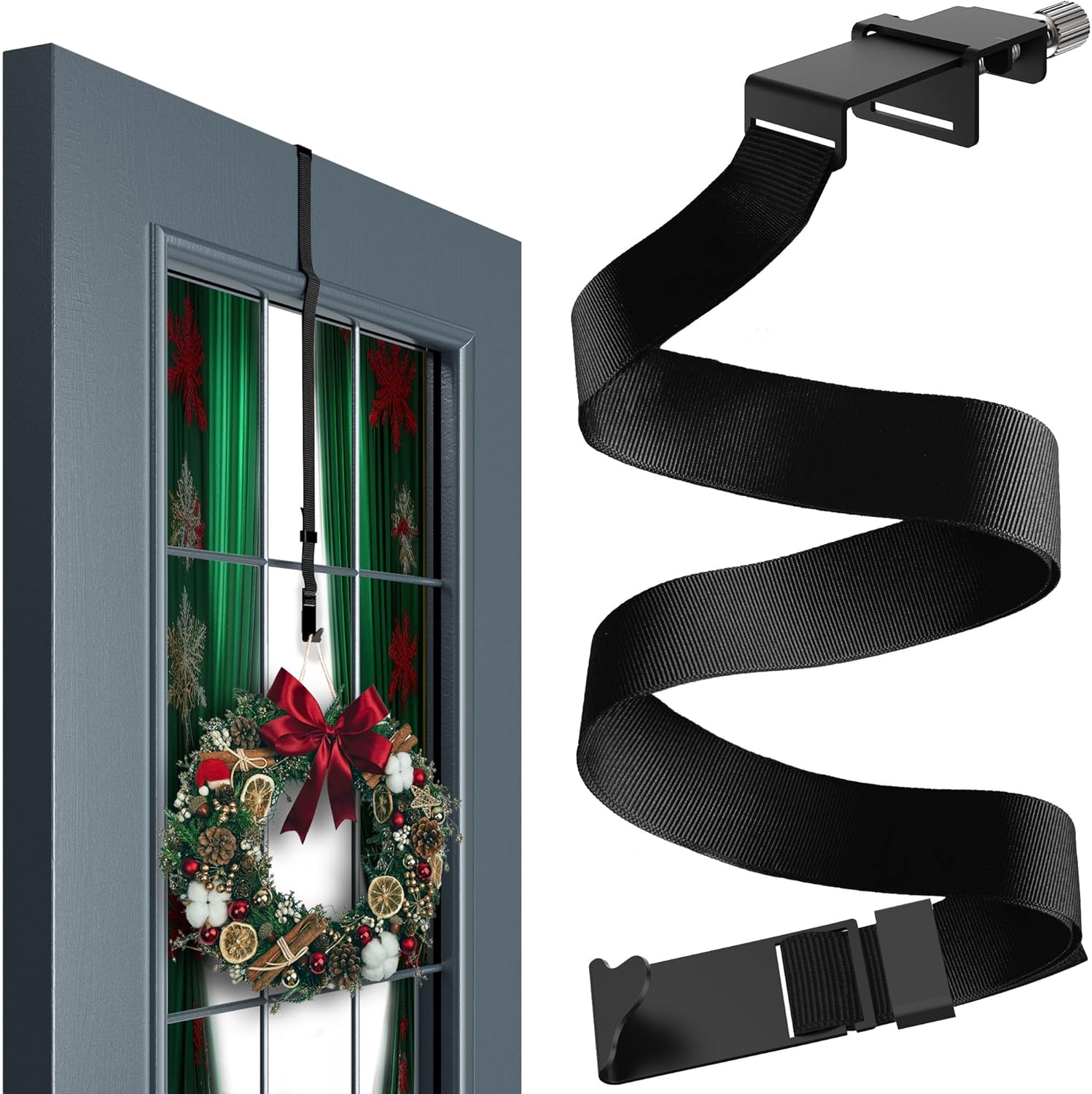 Featuring a soft padded design, this wreath hanger protects your door from scratches while holding up to 22 lbs. The reinforced fabric strap and strong metal hook ensure long-lasting use, ideal for heavy wreaths and seasonal displays. With a sleek black finish, it complements any home decor, making it a versatile choice for holidays like Christmas, Halloween, and more. Its easy installation and compatibility with various door types make it a must-have for every homeowner.