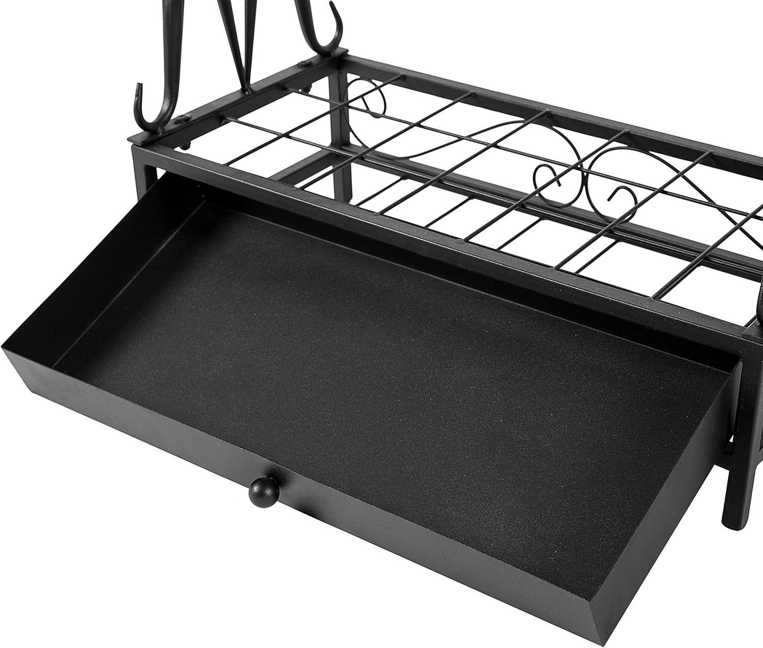 Elegant and functional black metal umbrella rack with 21 slots and 12 hooks. Includes removable drip tray for easy cleanup. Stylish design complements modern home decor. Durable and space-saving for any entry or outdoor area.