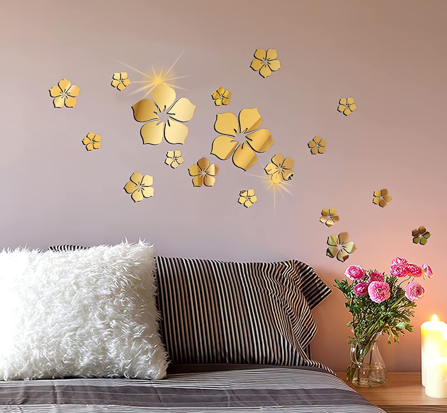 Create a stunning display with multiple sizes of gold 3D flower mirror stickers, tailored to fit any wall space or design preference.