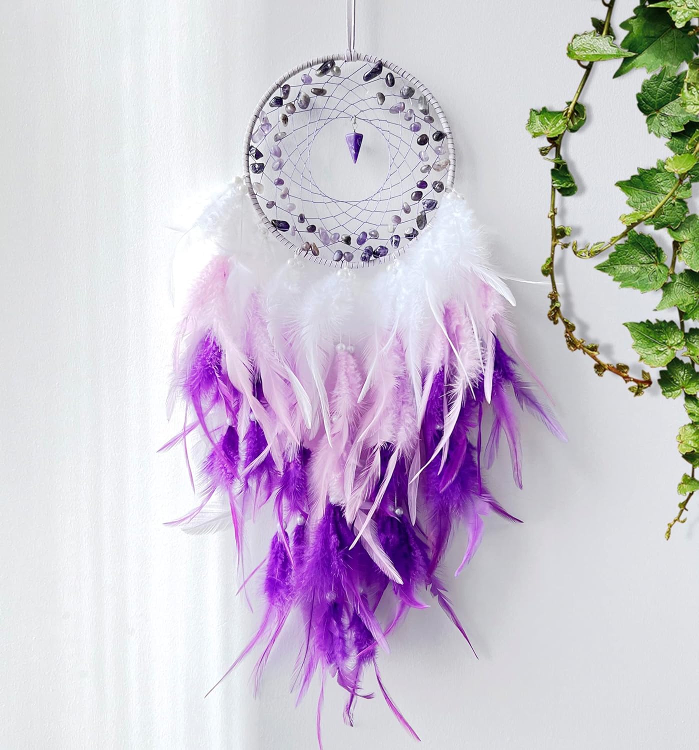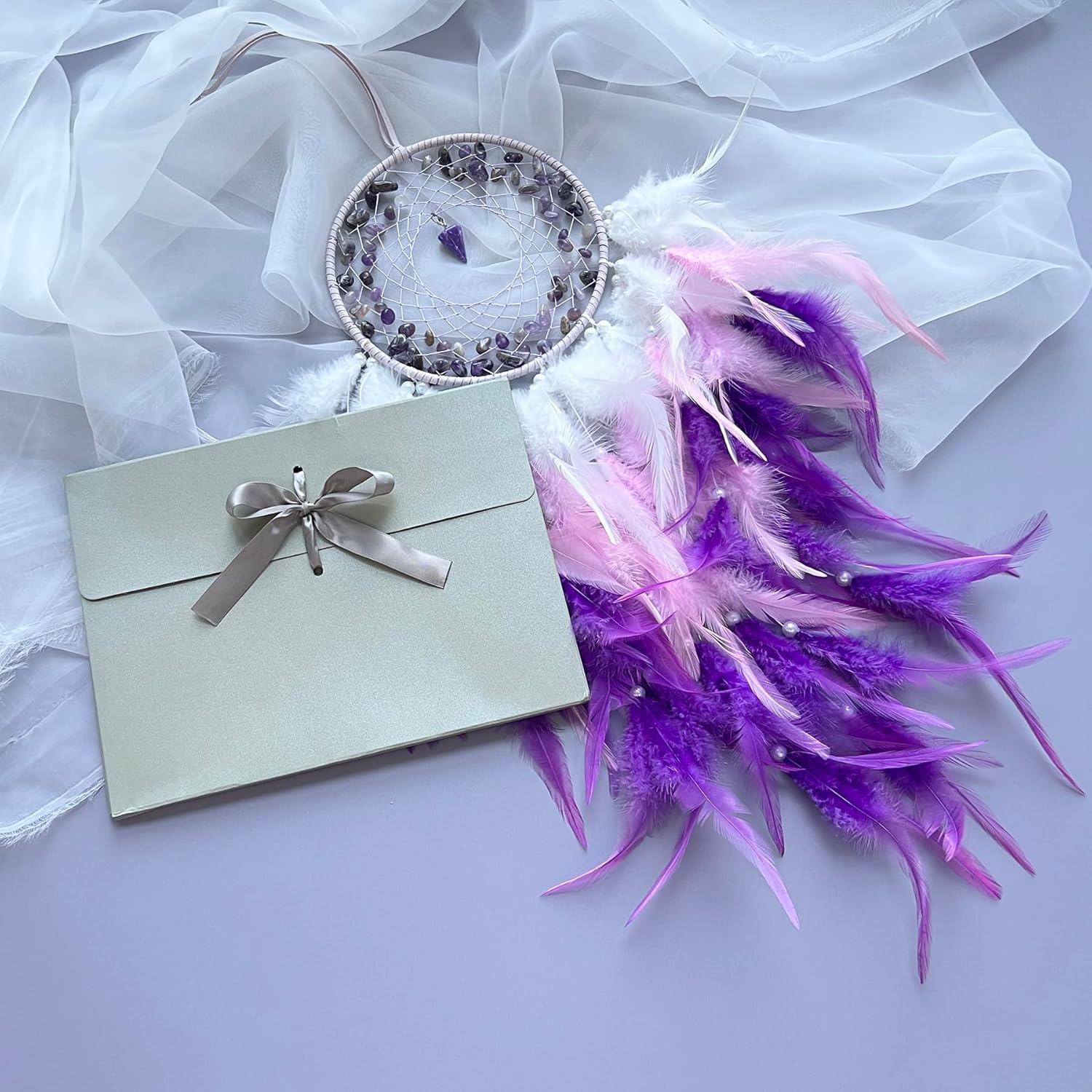 With the inclusion of lucky crystal stones and natural amethyst, these dream catchers offer a calming aura that helps create a peaceful atmosphere in your bedroom or living room. The soft feathers add a dreamy, ethereal look that complements any interior style.