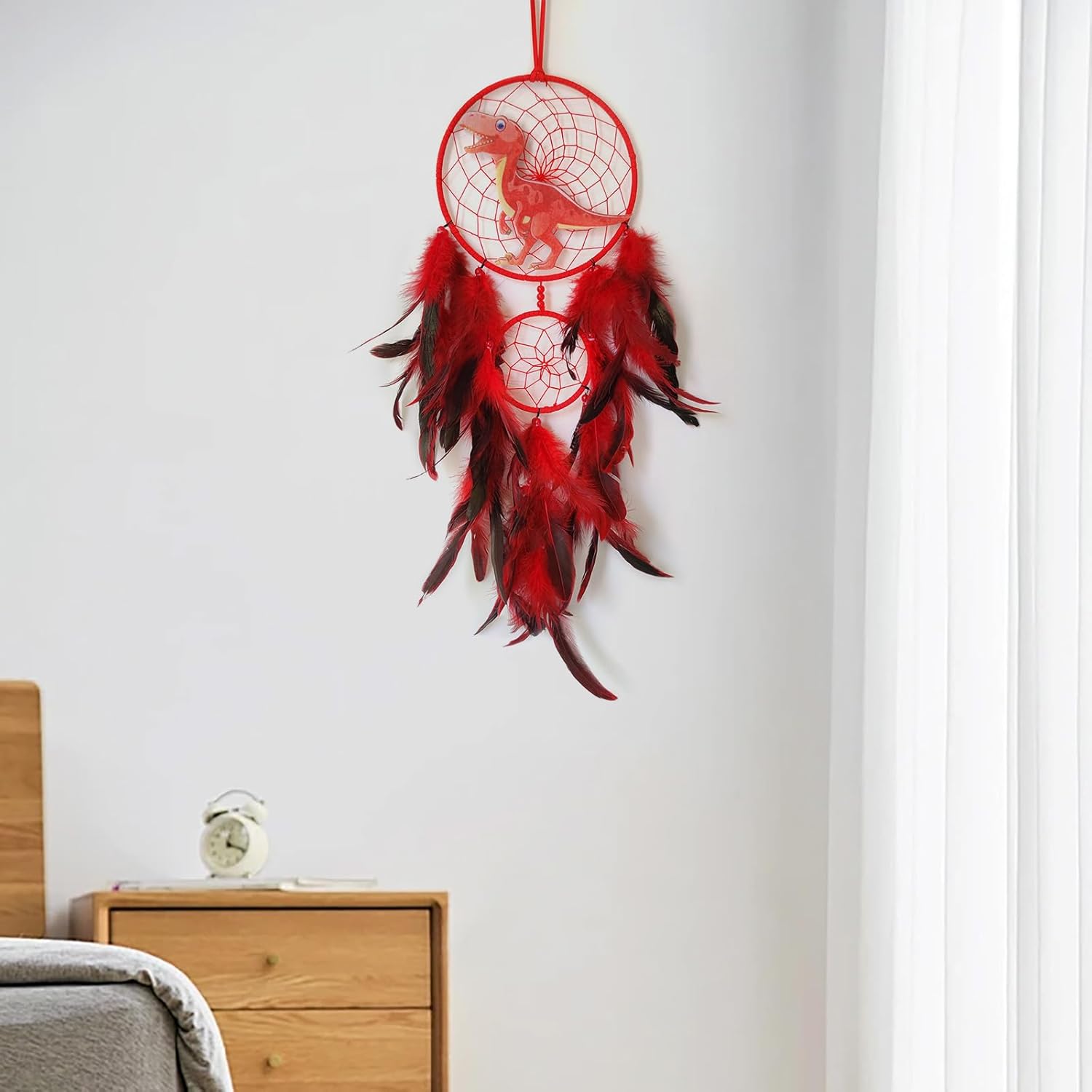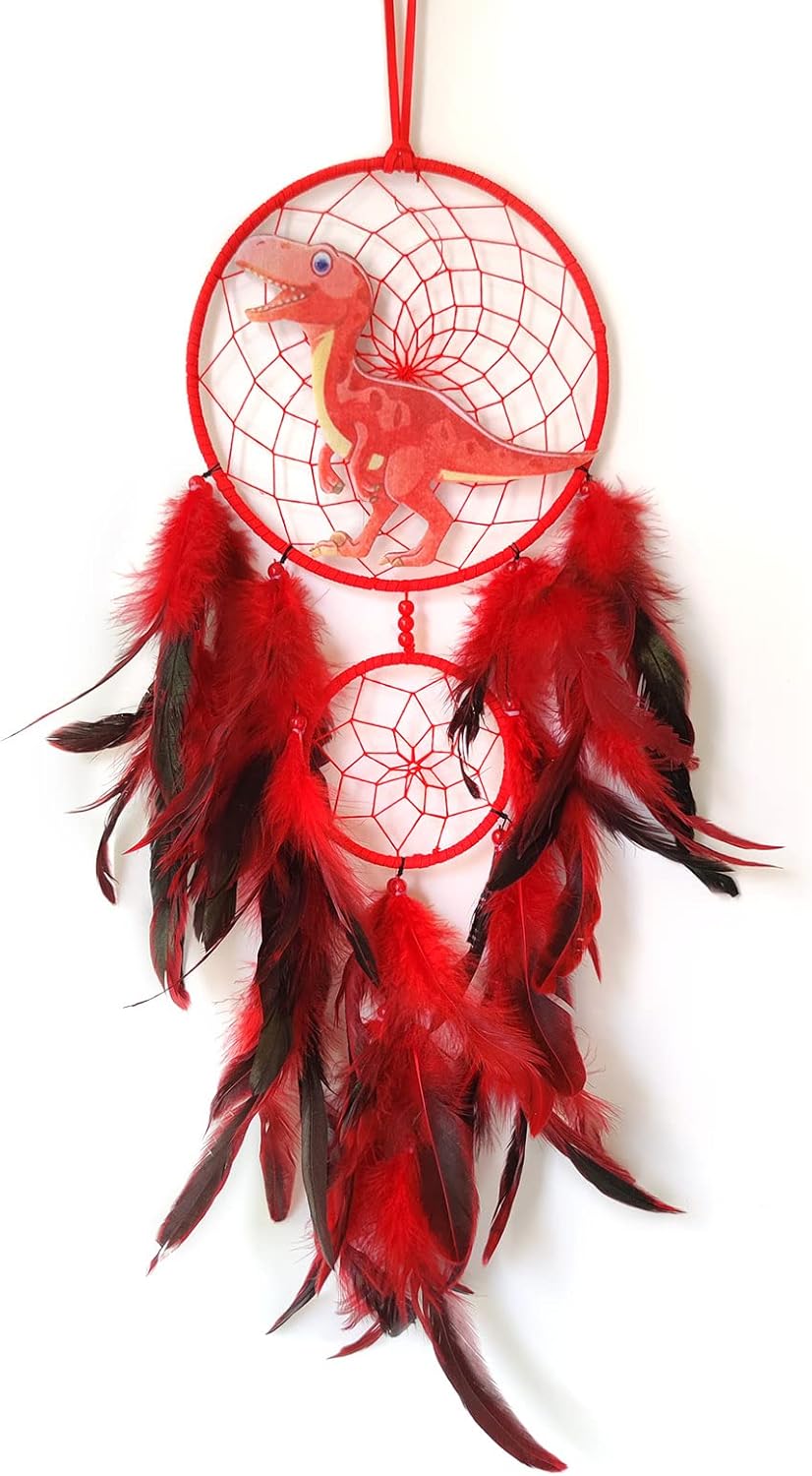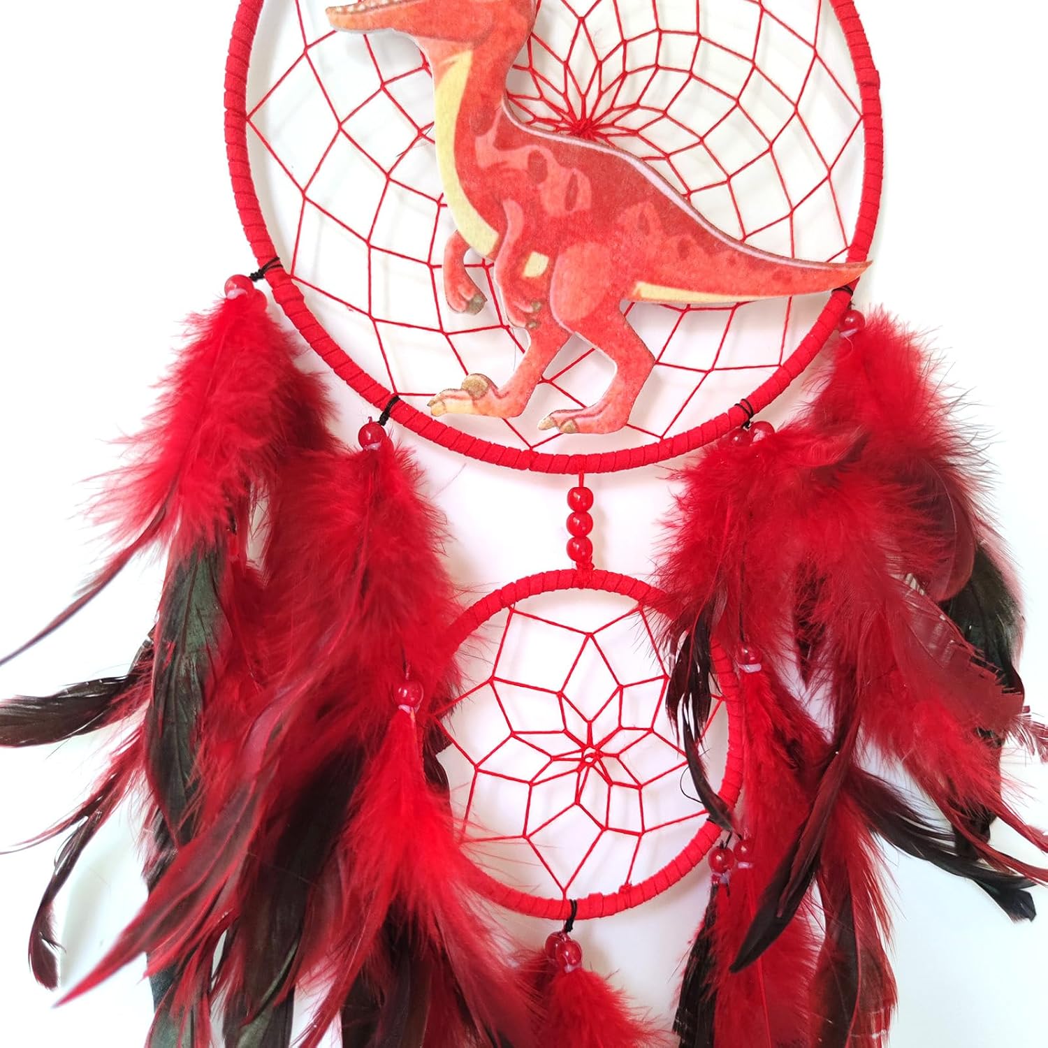 This stunning dream catcher wall decor is more than just a decorative pieceâitâs a meaningful symbol of hope, positivity, and well-being. Designed with a bold red dinosaur motif, it brings an eye-catching yet calming presence to any room. The intricate craftsmanship combines traditional dream catcher elements with a modern, eye-catching style, creating a unique piece that stands out in your home or space.