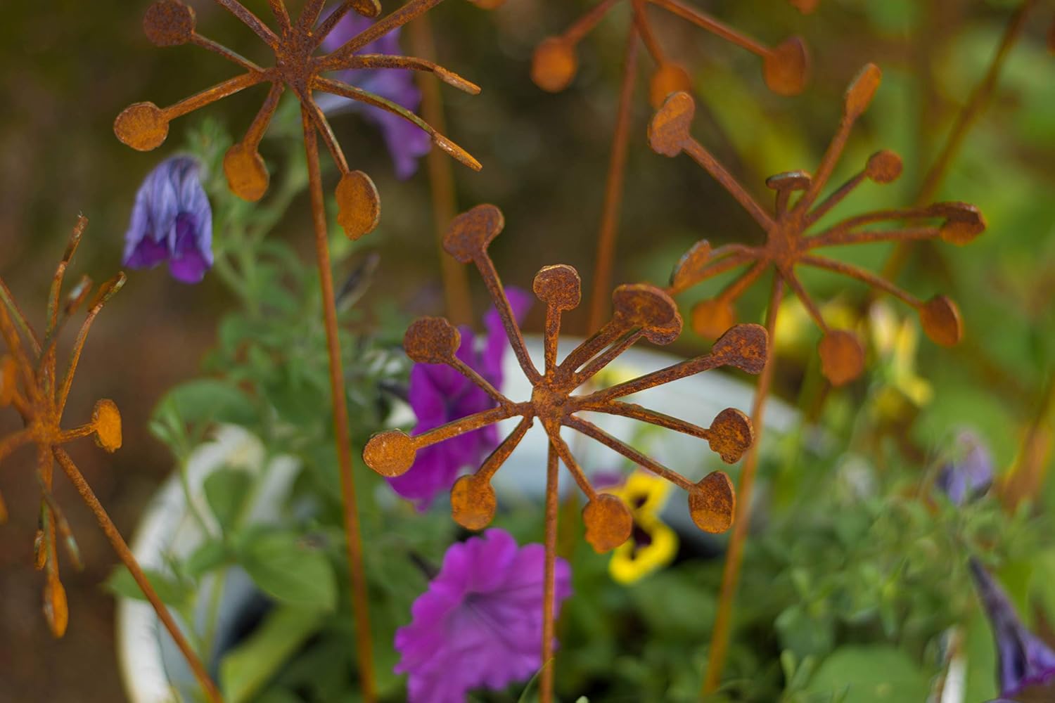 Each stake features an 18-inch length with a ball grouping of about 4x4 inches, making them easy to install and maintain. The customizable grouping with bendable stakes allows for endless design possibilities, enabling you to craft a display that suits your space perfectly. With their timeless outdoor decor appeal, these Rusty Metal Flowers add warmth, texture, and an artistic touch to any setting, from casual patios to formal garden spaces.