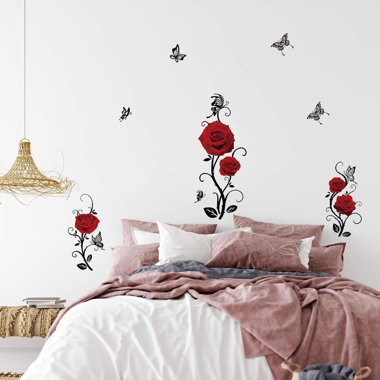 Bring a touch of timeless beauty and romance into your living space with this stunning wall sticker featuring elegant red roses and black butterflies. Perfect for adding a romantic ambiance to your bedroom, living room, or even as a statement piece above your sofa or TV wall, this design is both sophisticated and versatile.
