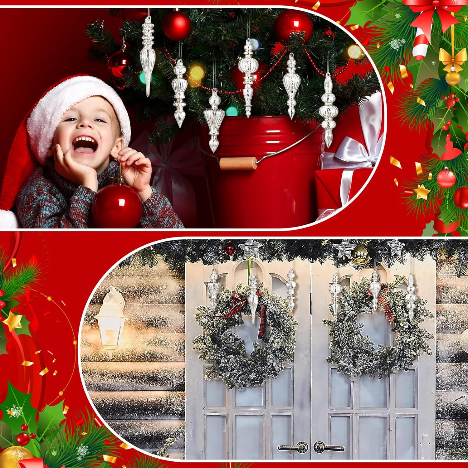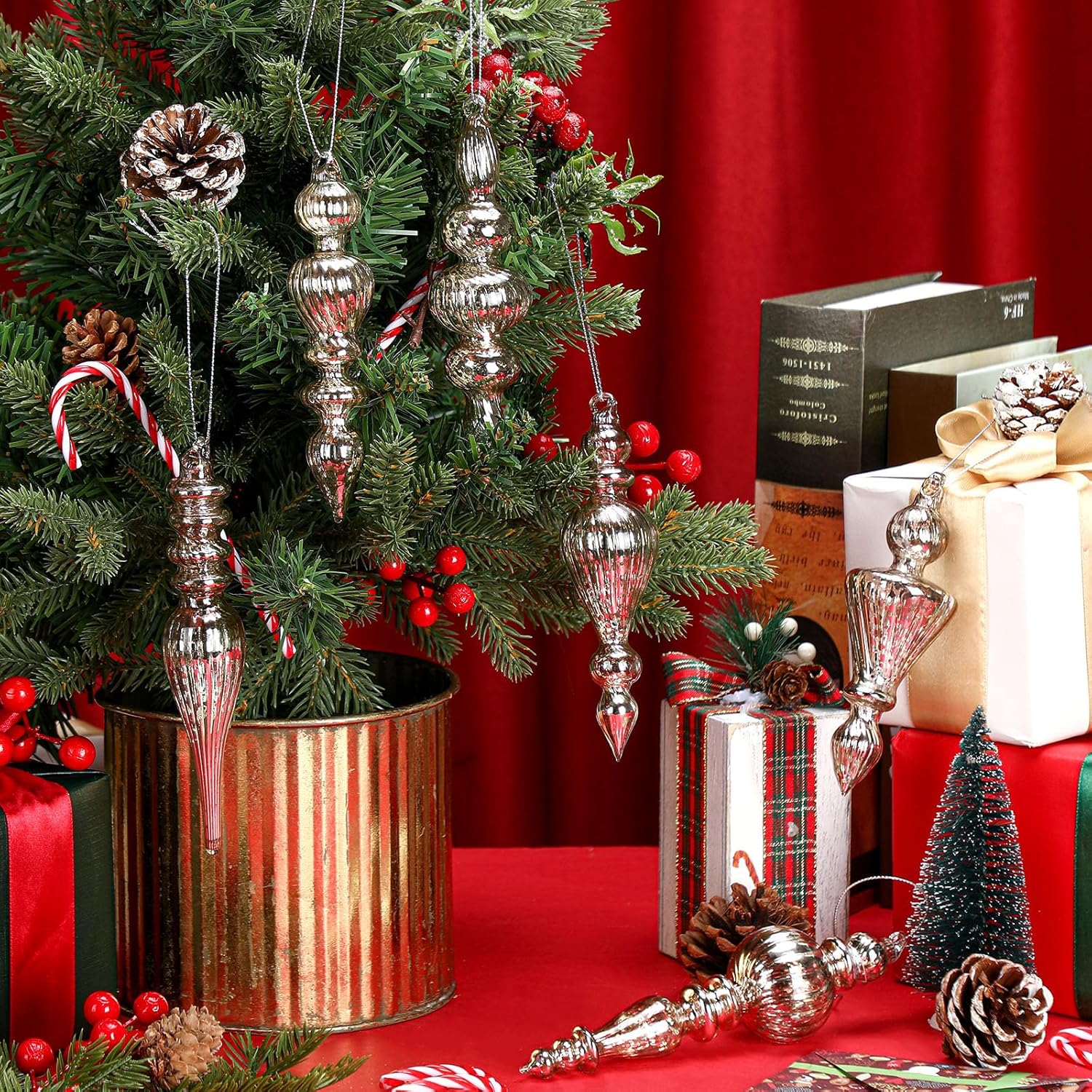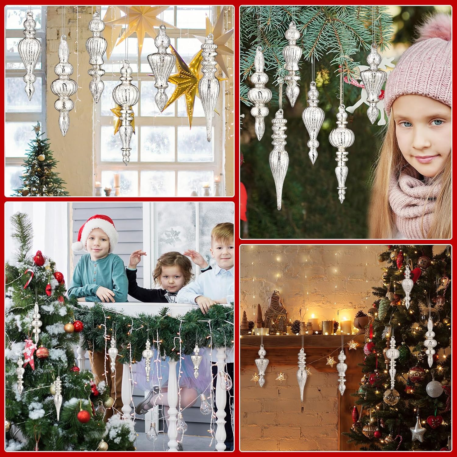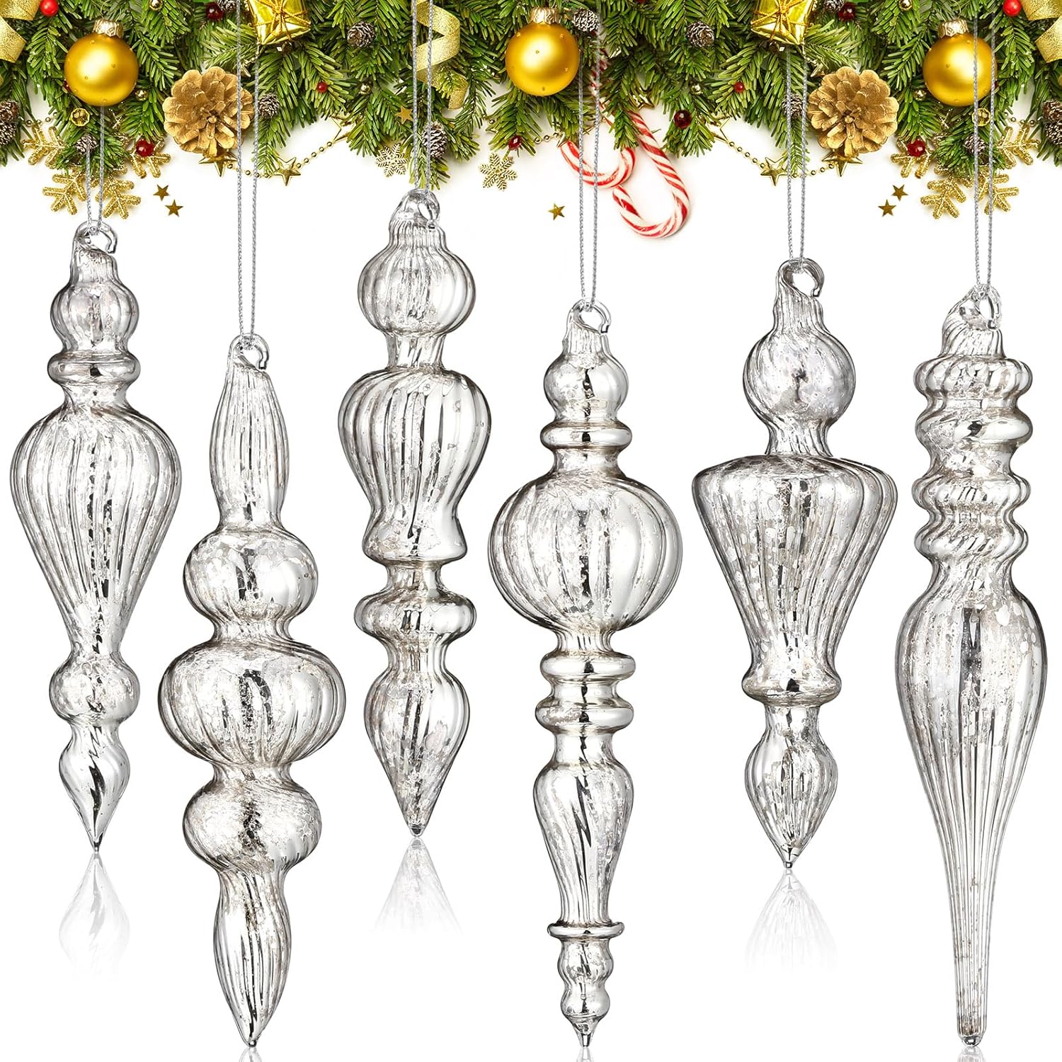 Elevate your holiday decor with these 6-piece mercury glass finials, crafted to enhance both style and functionality. Each finial is made from premium, shatterproof glass, ensuring it remains a cherished part of your festive setup for years to come. The sleek, classic silver finish adds a touch of elegance and sophistication to your Christmas tree or wreath.
