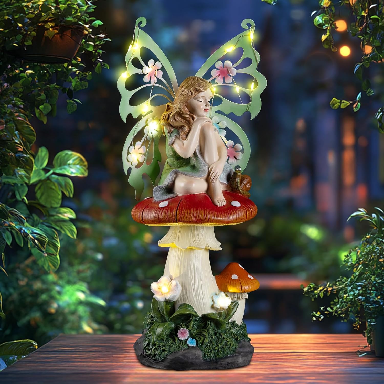 Transform your outdoor space into a magical wonderland with this enchanting solar fairy garden decor. Perfect for adding a touch of whimsy and charm to your garden, patio, or indoor area, it features a delicate fairy with intricate hand-painted wings, a playful mushroom, and a tiny snail.