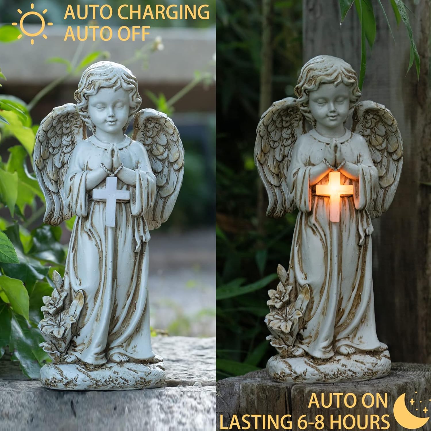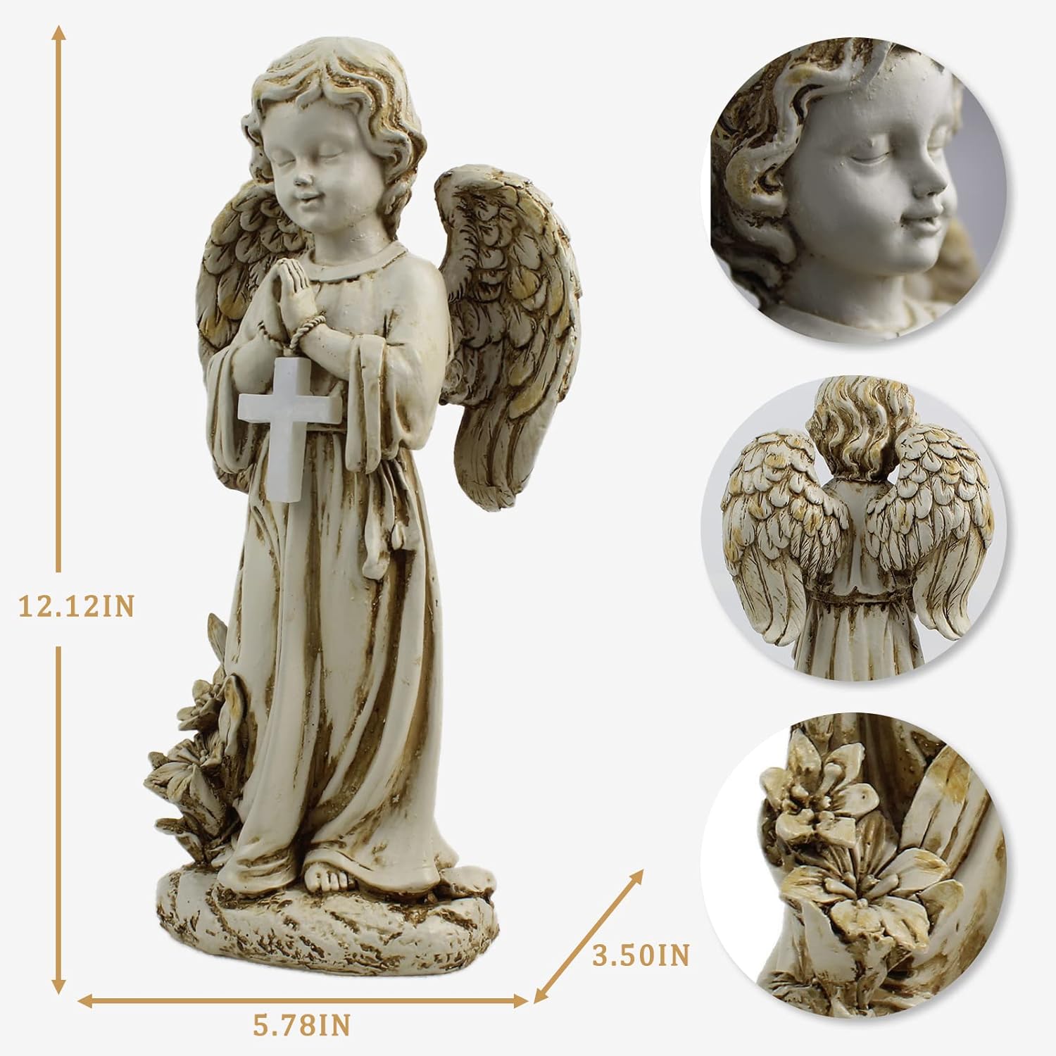 A solar-powered, hand-painted resin angel statue for garden, cemetery, or patio decor. It features intricate wings, flowers, and cross details, making it a perfect addition for memorials, birthdays, anniversaries, and more. This outdoor angel sculpture is designed to stand strong in any weather and symbolizes love and peace for every occasion.