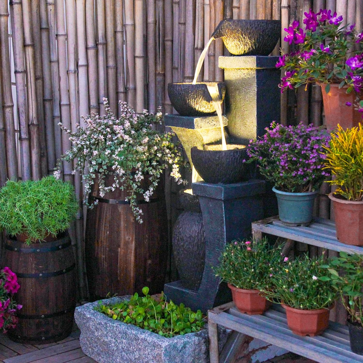 The built-in LED lights give it a soft, ambient glow that enhances the nighttime atmosphere, turning your outdoor space into a peaceful retreat. Its three-tier cascading layout is reminiscent of classic garden fountains, yet designed with a modern aesthetic that complements contemporary styles. Easy to set up with the included pump and power cord, this fountain combines style, function, and convenience in one elegant piece.