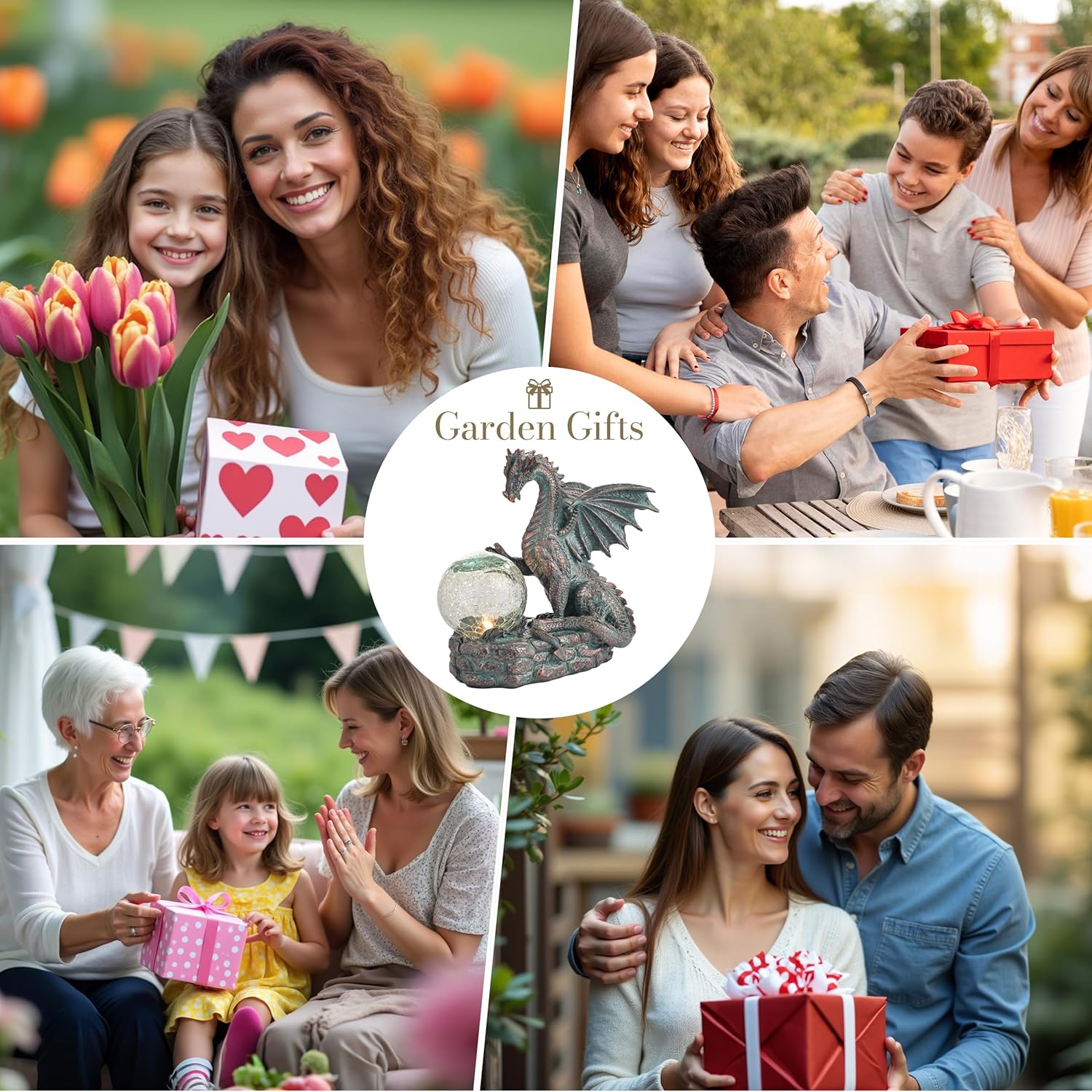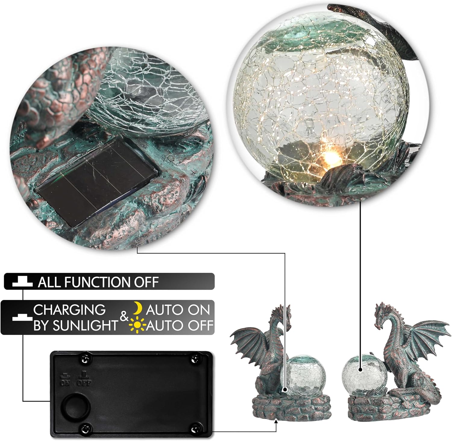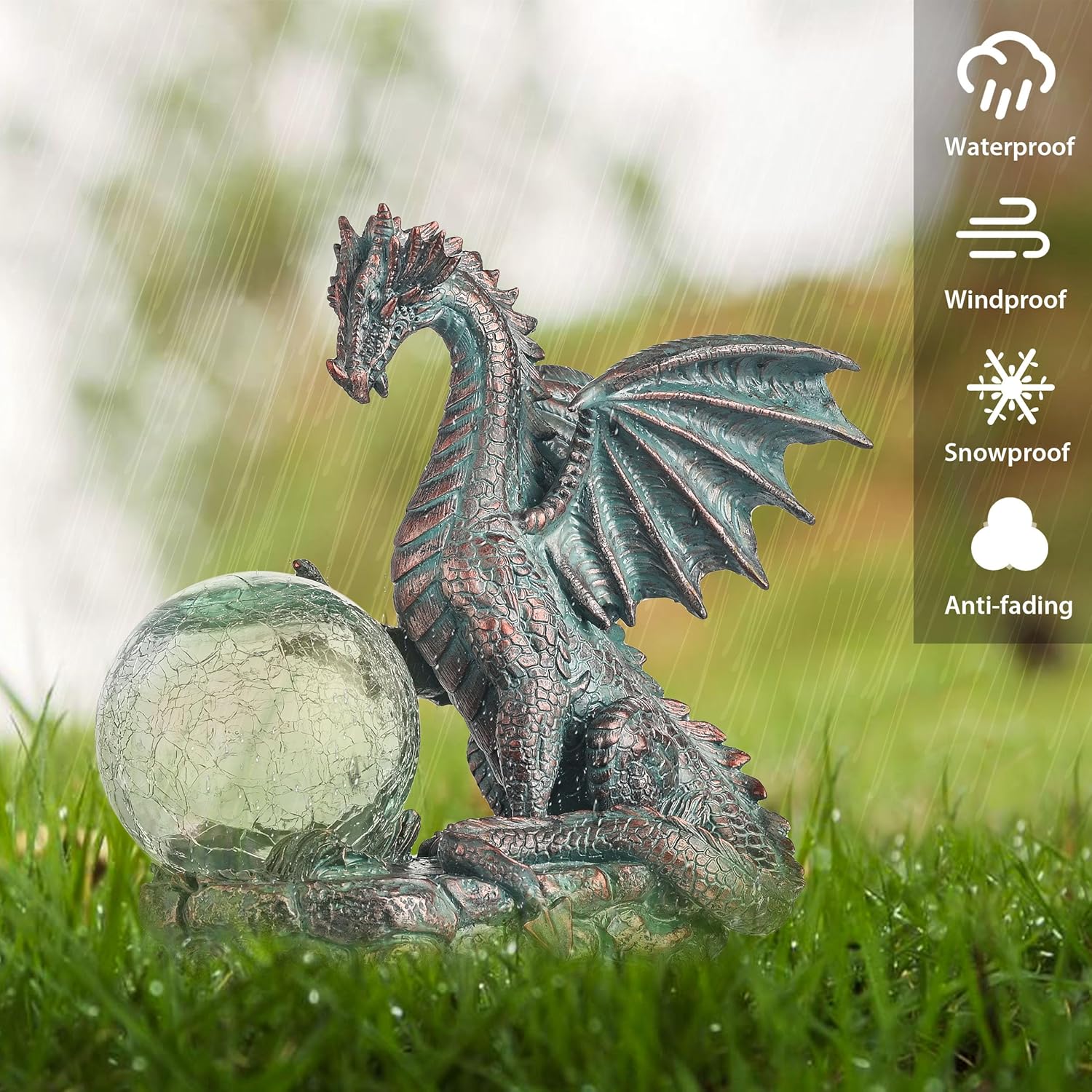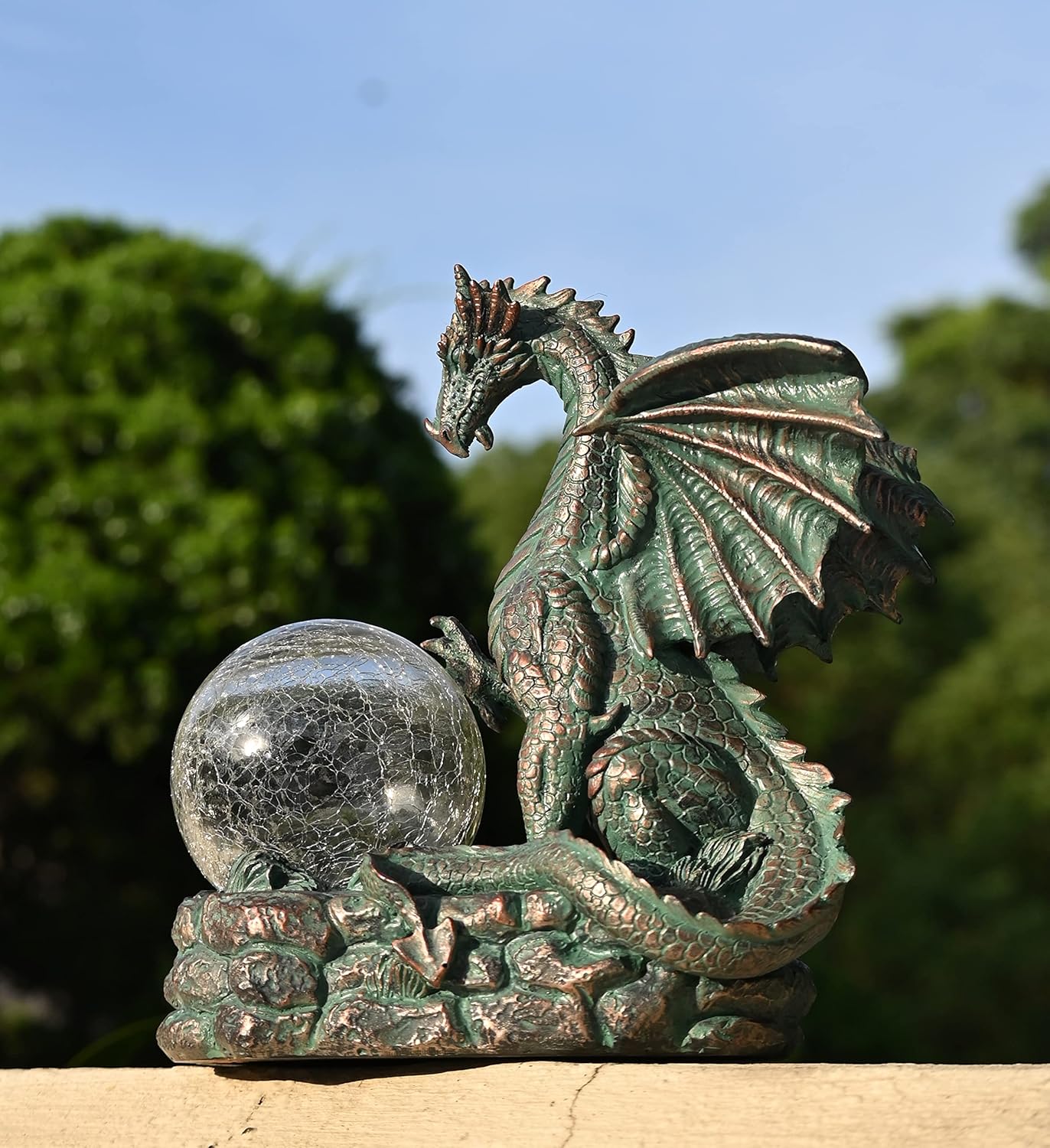 Add a touch of enchantment and elegance to your outdoor space with this handcrafted dragon statue featuring a glowing crystal ball. The solar-powered crackle globe light emits a warm, inviting glow that enhances your garden, patio, or lawn with magical nighttime illumination. Designed to blend beauty with practicality, the statue is made from durable resin and bronze finish, ensuring it withstands the elements and remains stunning over time. Whether you're looking to accent your entrance, highlight a garden path, or create a whimsical focal point, this statue brings timeless charm and a sense of wonder to any outdoor setting.