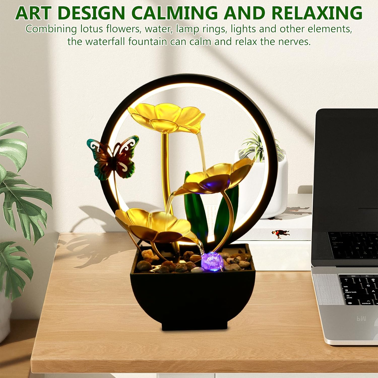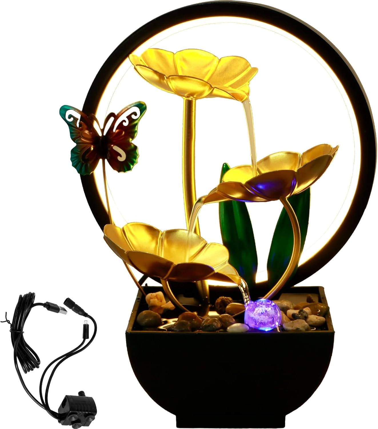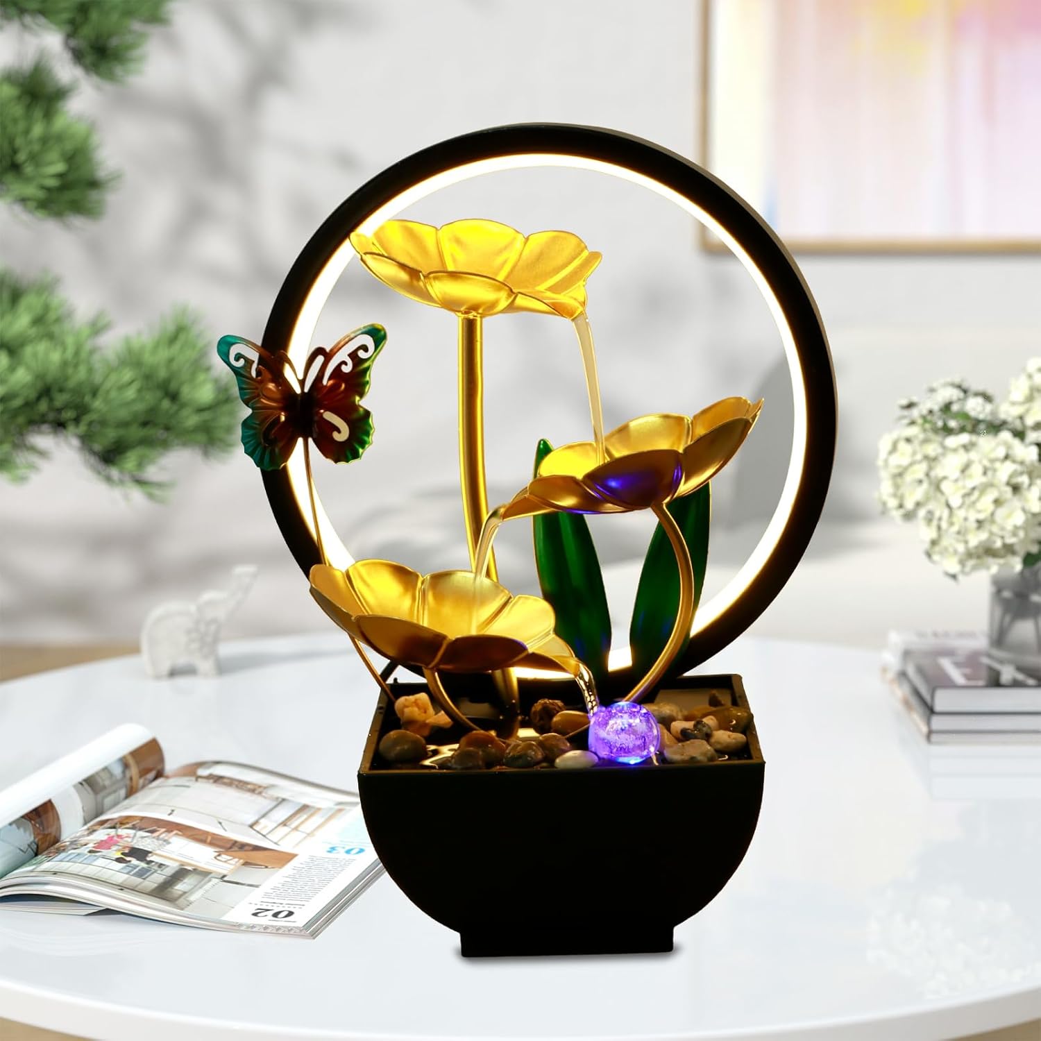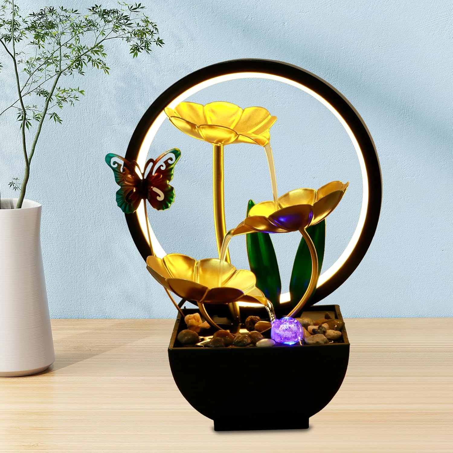 Transform your space with this beautifully designed tabletop water fountain. Powered by USB, it's a convenient and energy-efficient way to bring serenity and elegance into your home or office. The soft LED ring light adds a soothing glow, enhancing the ambiance and making it a perfect focal point for relaxation.