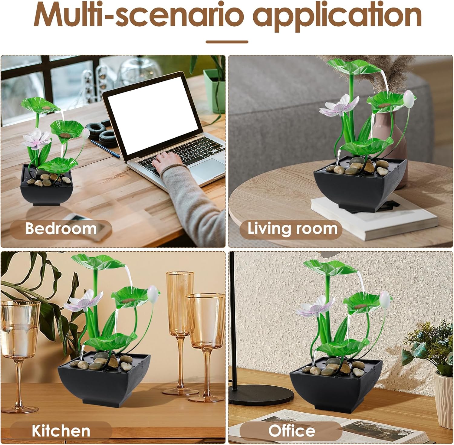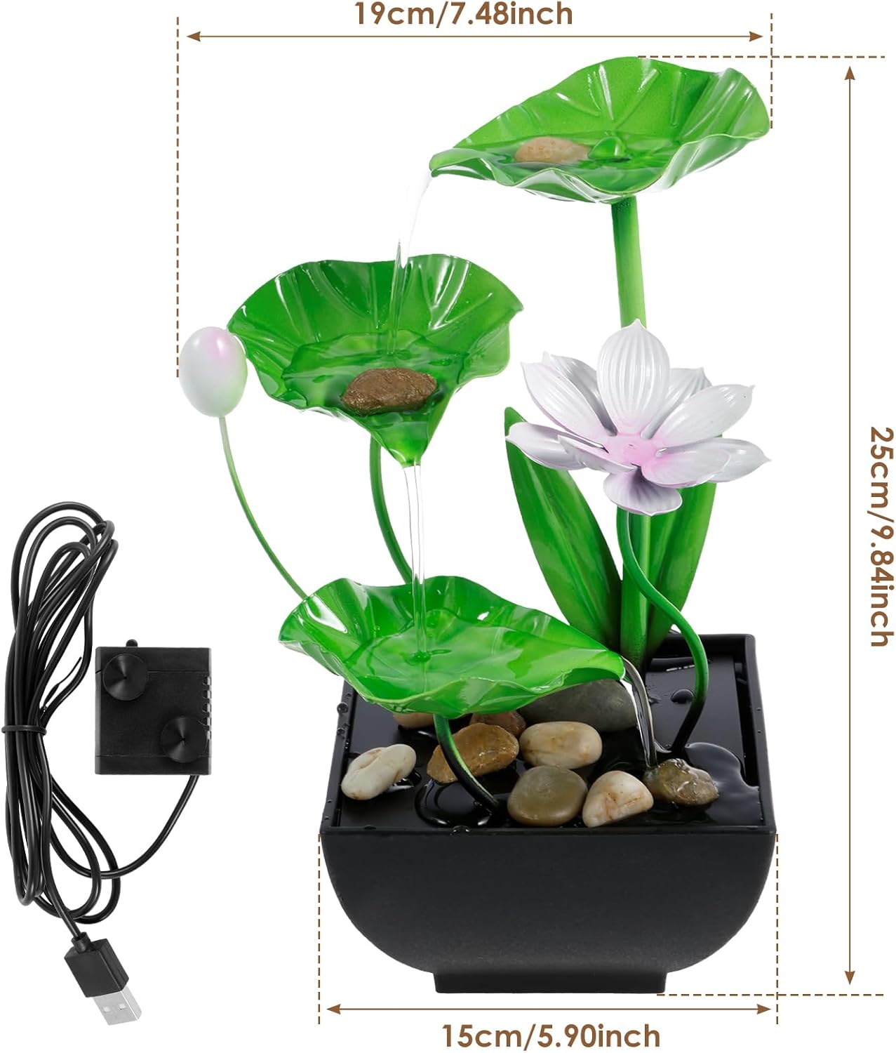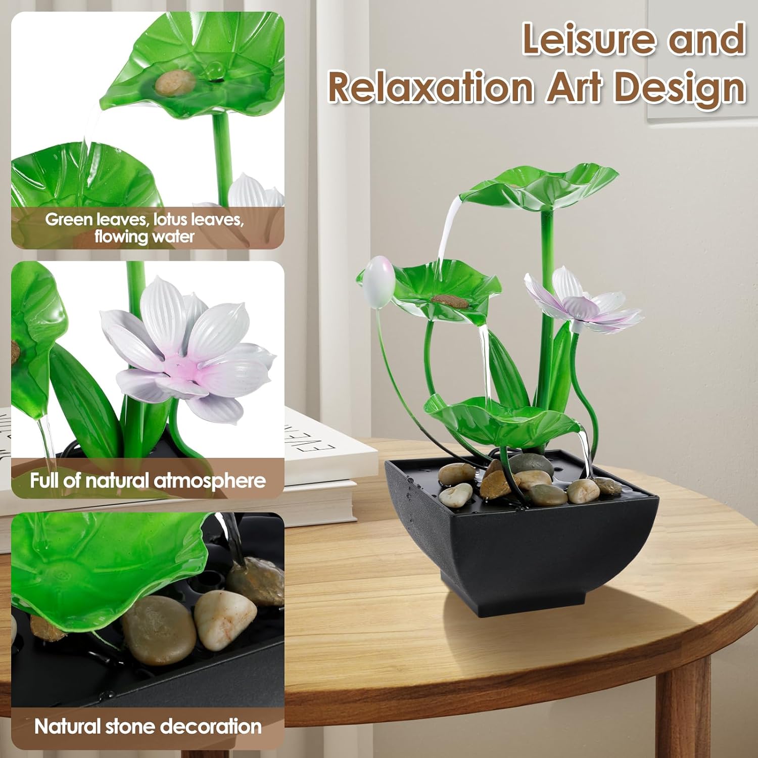 This Water Lily Fountain is not just a decorative pieceâit's a lifestyle upgrade. Its compact size makes it easy to place on desks, tables, or even in your garden, porch, or patio. Ideal for those who want to enjoy the benefits of a natural water feature without the hassle of complex installation. With a subtle yet effective sound, the fountain promotes relaxation, helping you unwind, meditate, or focus in a quiet and welcoming environment.