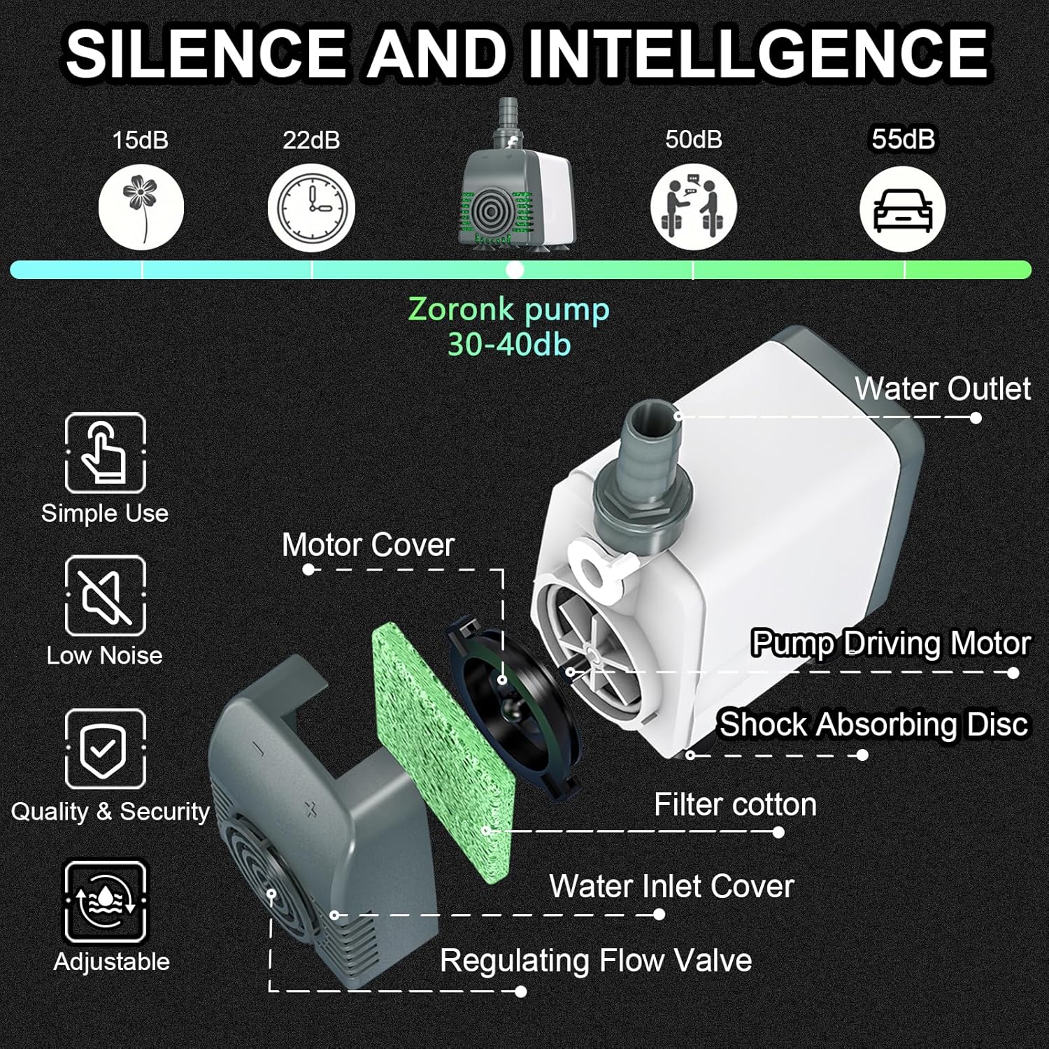 Featuring durable construction and a 1-year warranty for peace of mind, this Zoronk submersible water pump is a reliable choice for your hydroponic, water garden, or aquarium needs. Itâs designed to keep your water flowing smoothly, day after day, with exceptional value and performance.