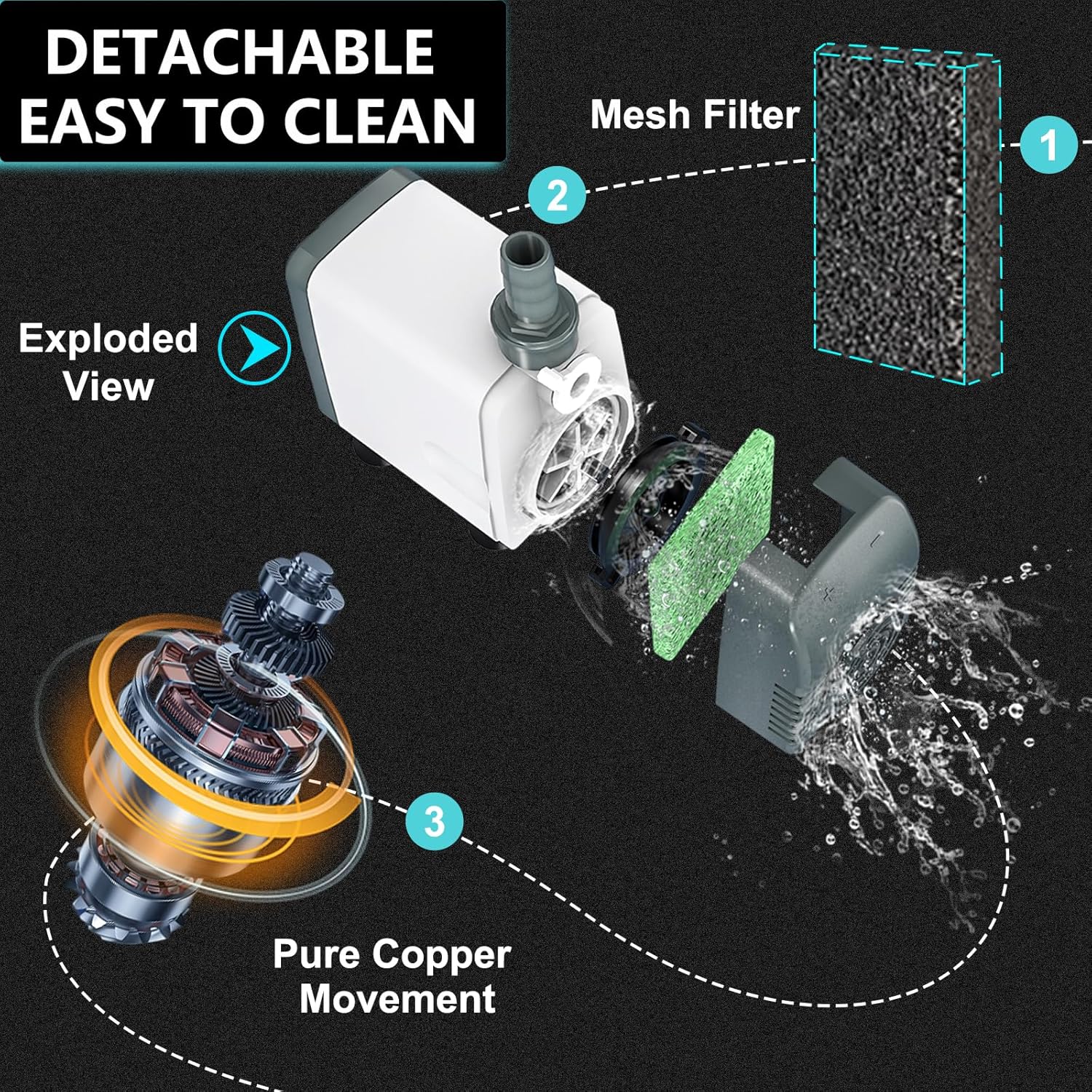 Engineered for long-term reliability, this submersible water pump is built to endure the toughest conditions with a corrosion-resistant design that can extend its lifespan by up to twice. Its 3-stage debris protection system includes a dual-layer foam filter that's easy to remove and clean, trapping larger particles like leaves and fish waste to ensure optimal performance and prevent clogging, even in muddy or contaminated environments.